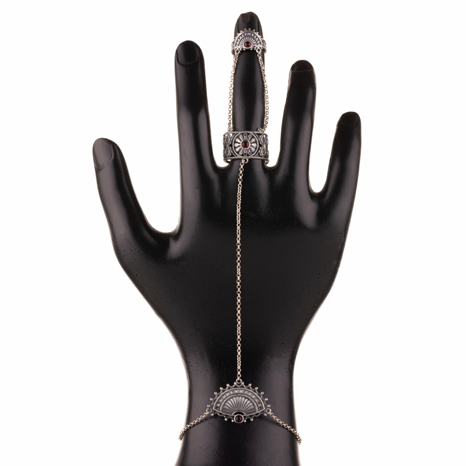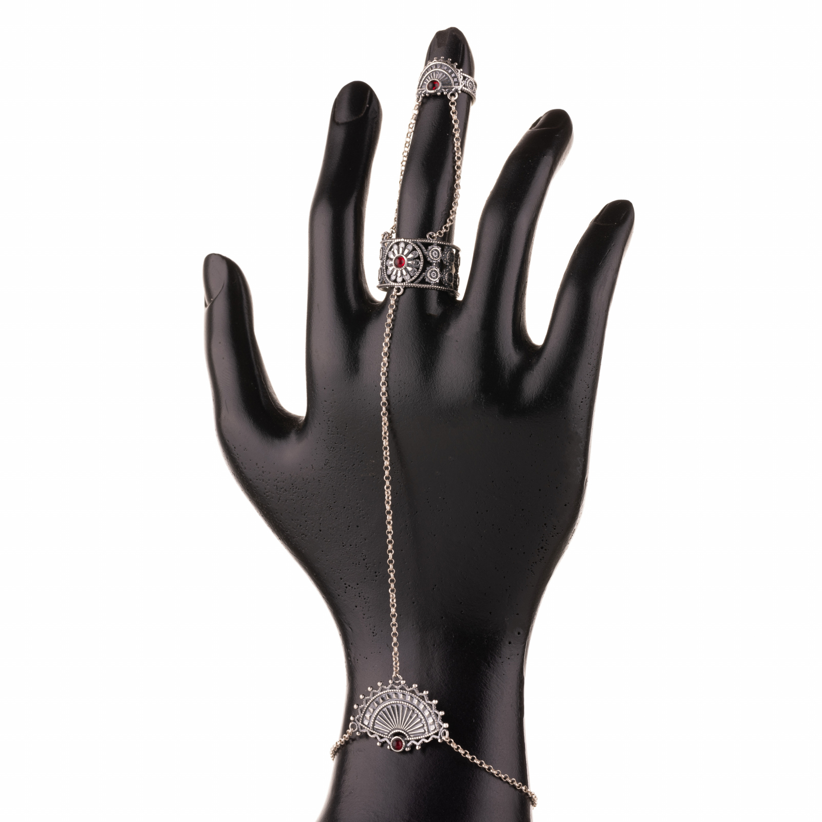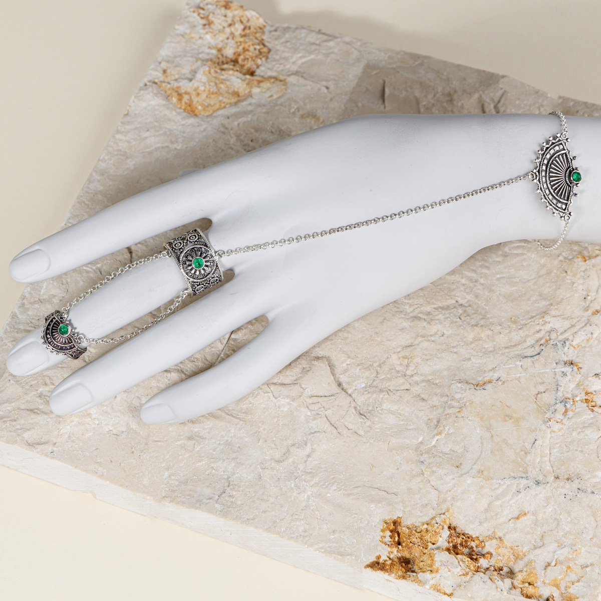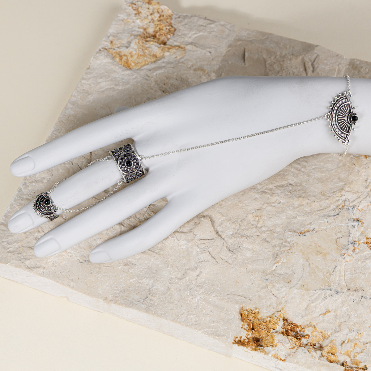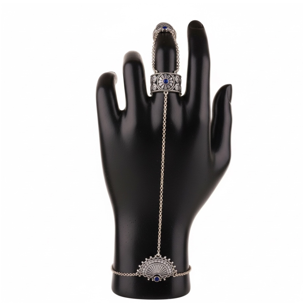 Brățara și cele trei inele sunt legate prin lanțuri delicate, creând o linie de energie care pornește din palmă și urcă spre vârful degetelor. Fiecare detaliu e un omagiu adus armoniei dintre putere și finețe.