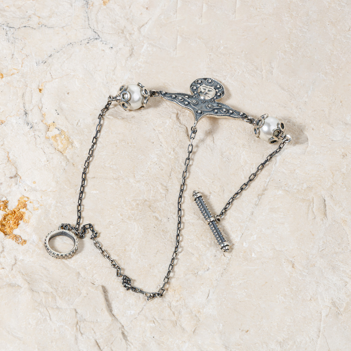 Realizată din argint 925 și perle de cultură, brățara îmbină armonios tradiția sacră cu eleganța contemporană. Forma delicată a îngerului evocă protecția divină și puritatea, în timp ce perlele adaugă o notă de grație și echilibru.