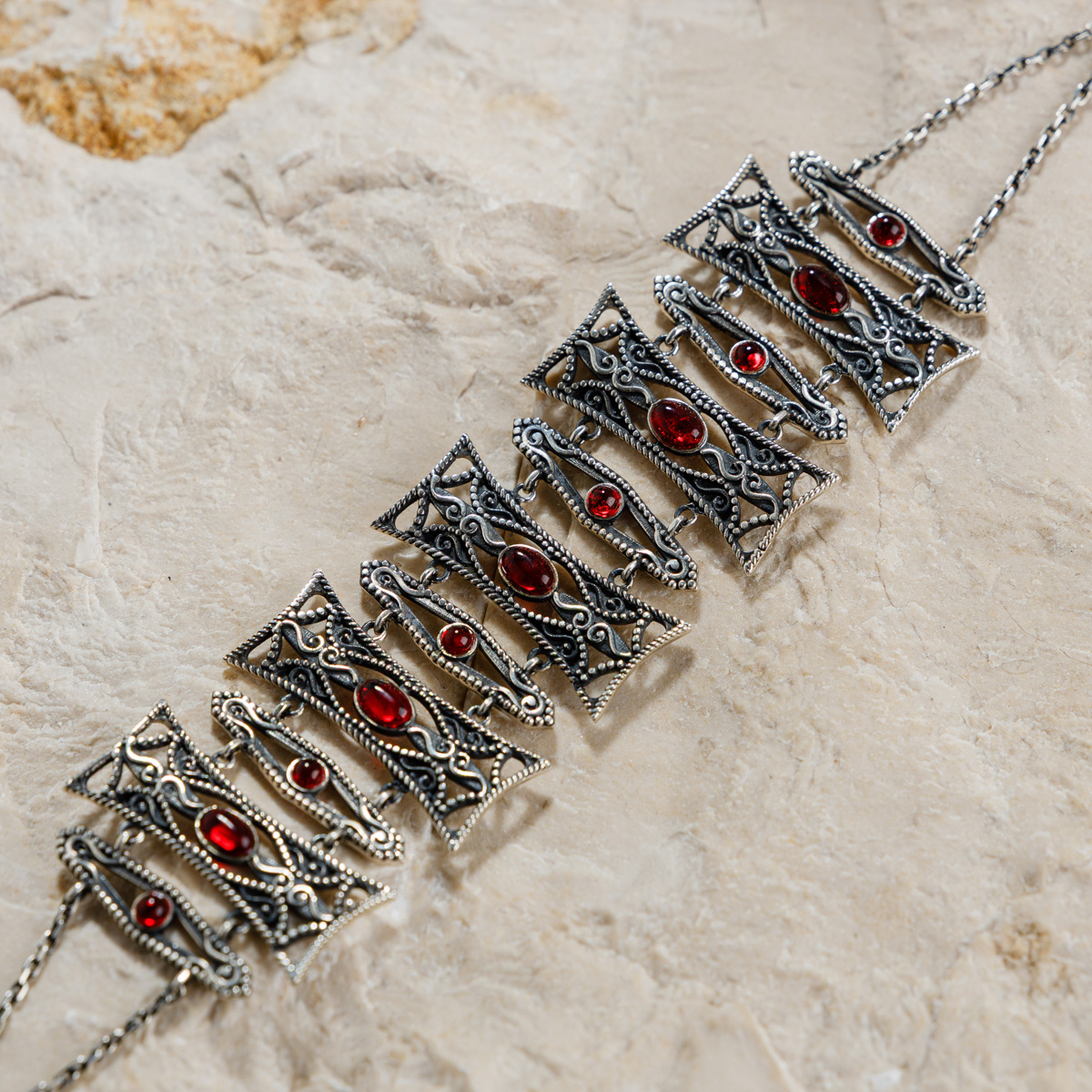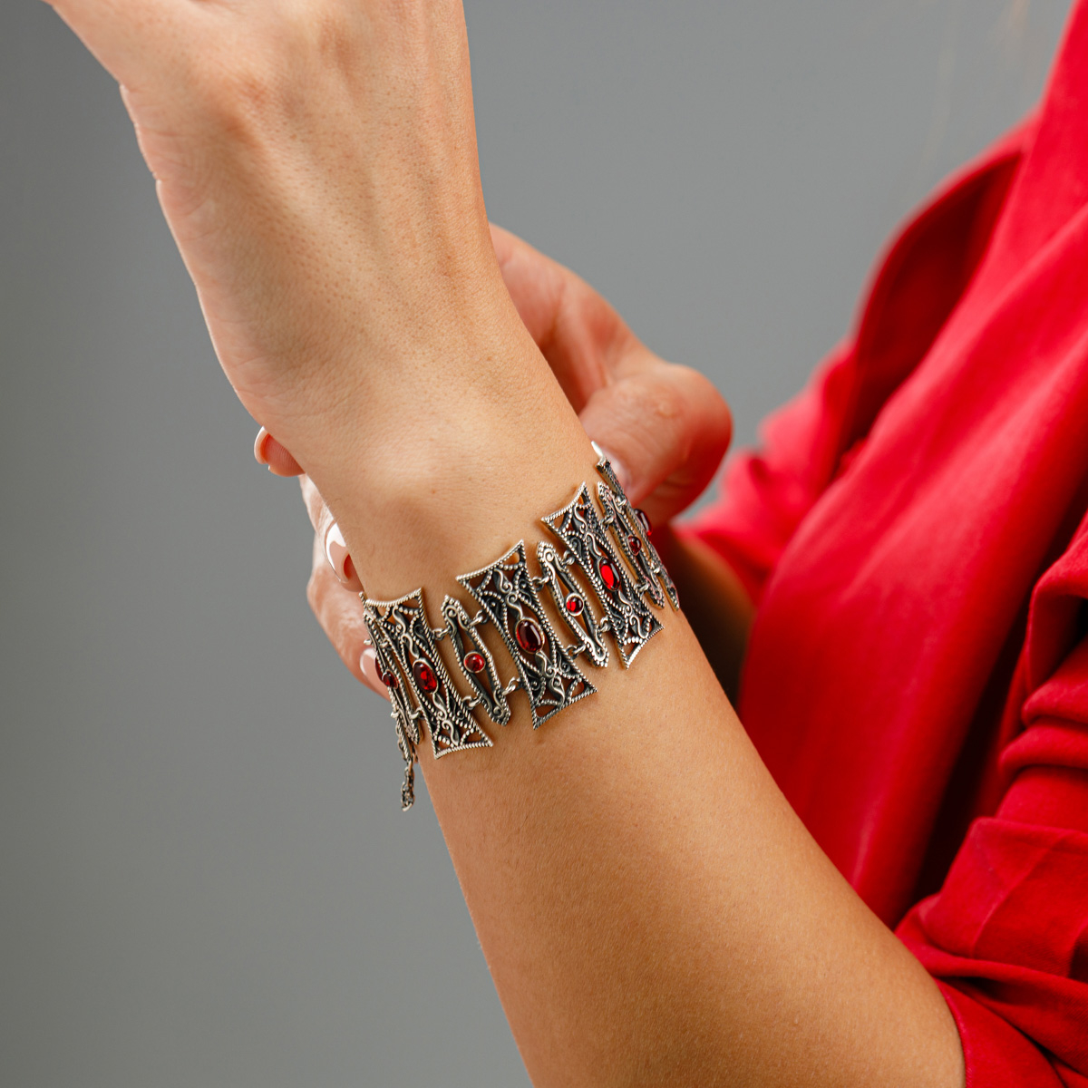 Brățara reflectă eleganța și forța blândă asociată zeiței. Formele alungite și detaliile fine amintesc de sculpturile și bijuteriile armene medievale, iar accentele roșii adaugă o notă de pasiune și vitalitate.