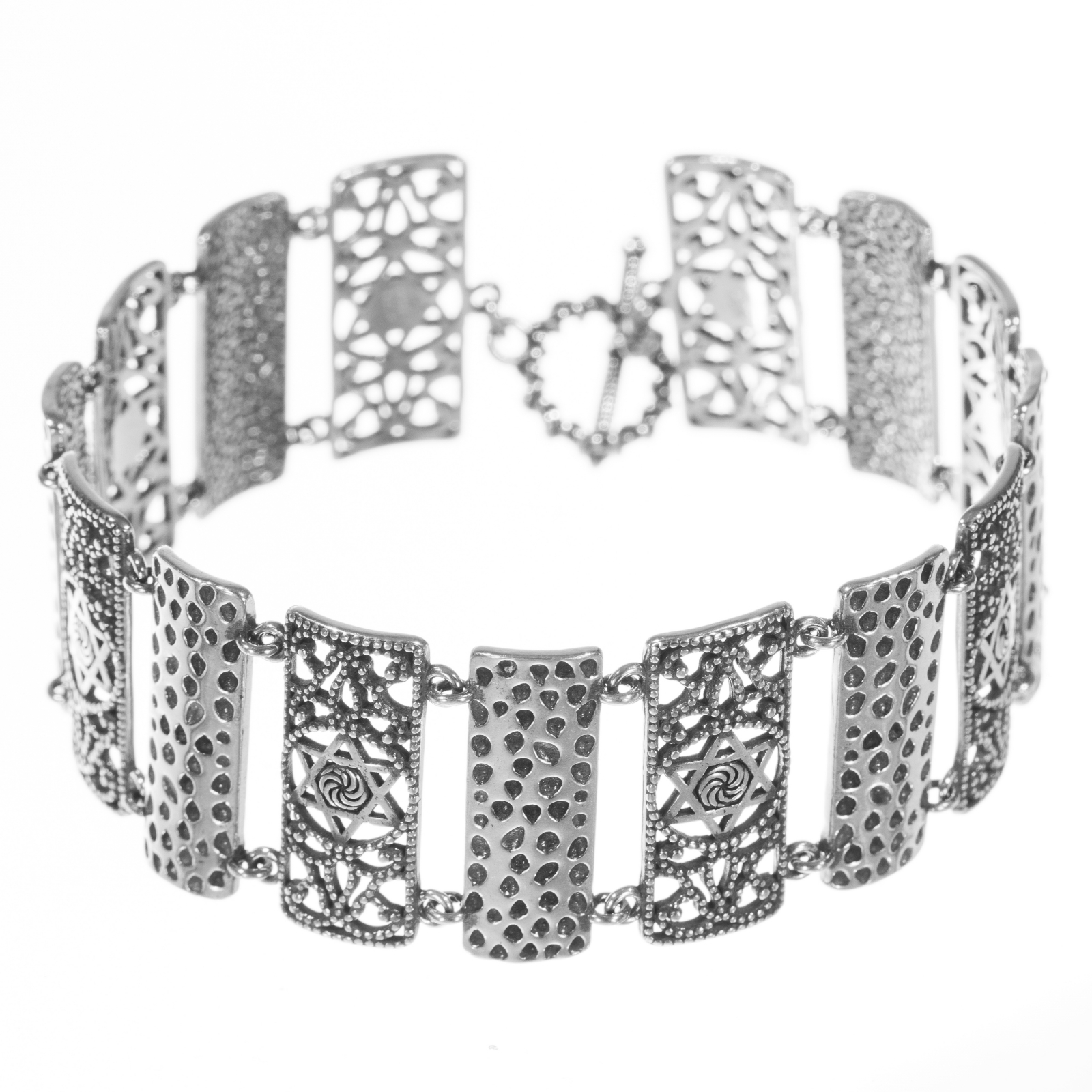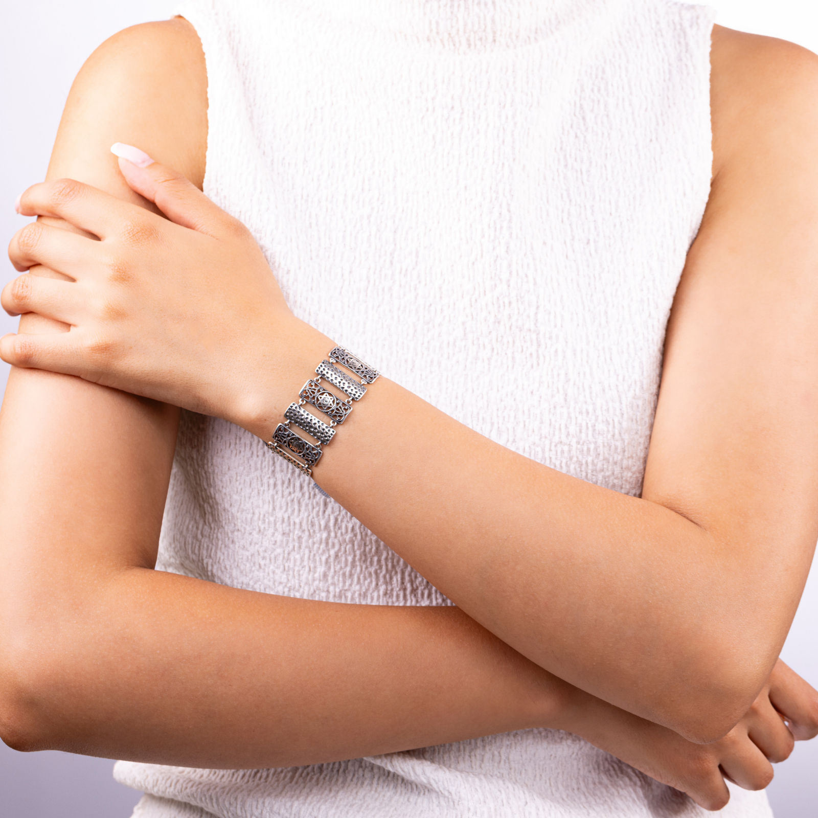 Brățara este compusă din segmente alternante: unele pline de textură, altele dantelate cu simboluri stelare și motive geometrice fine. În centrul fiecărei stele se află o spirală – nu doar un decor, ci un simbol al direcției, al continuității, al identității care persistă.