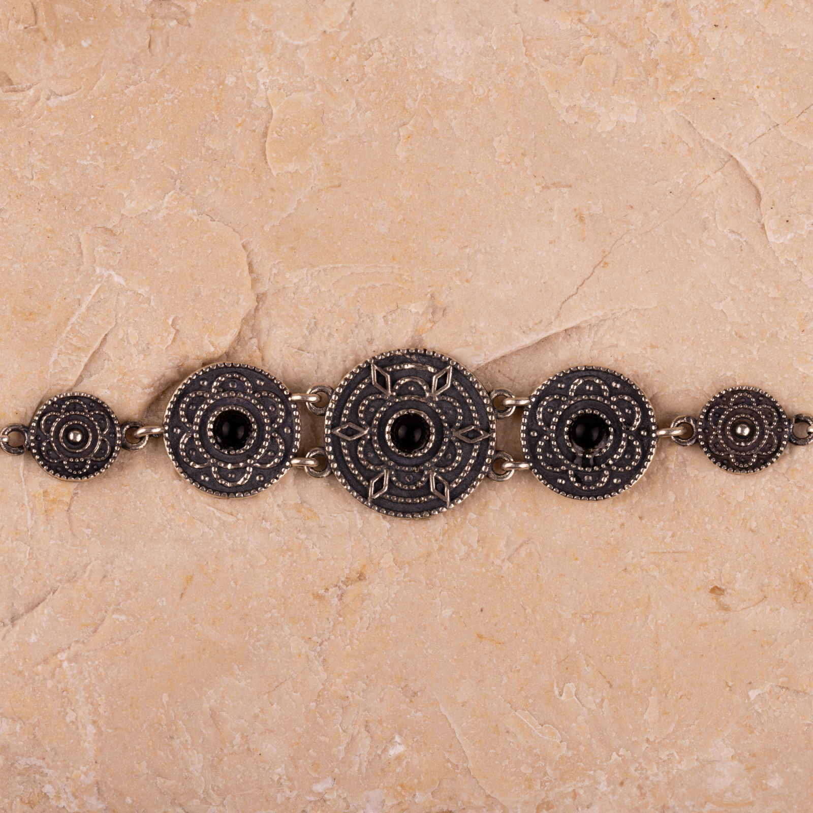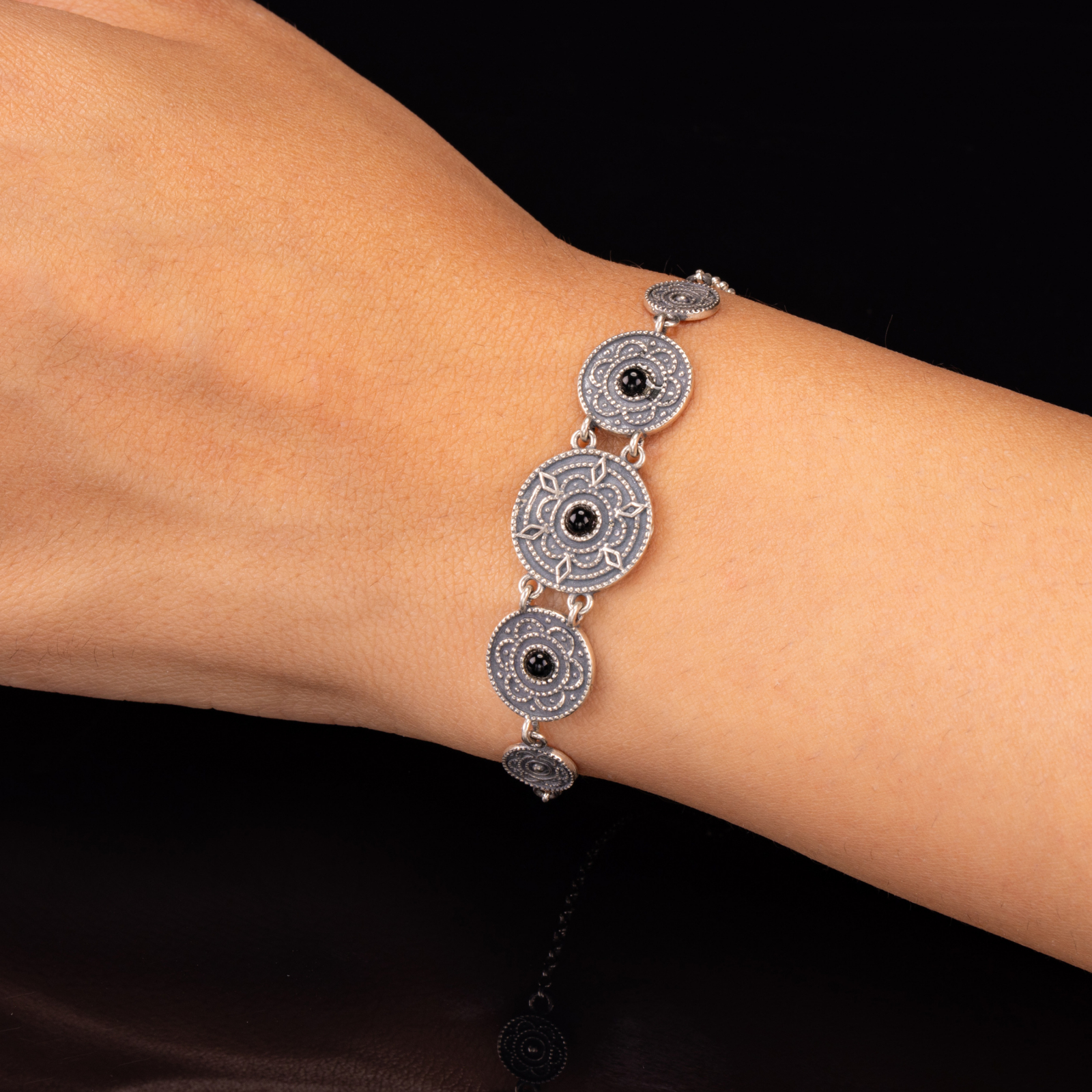 Segmentată în forme circulare de mărimi diferite, fiecare disc este lucrat în argint antichizat, cu detalii sculptate și o piatră centrală închisă ca un ochi păzitor.