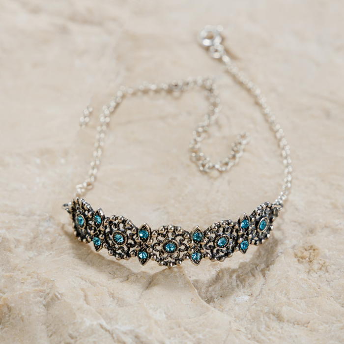 Siruné este o bijuterie florală reinterpretată - un inel larg, lucrat cu migală în argint 925 oxidat, decorat cu motive simetrice și pietre turcoaz care pulsează ca niște ochi de lumină.
