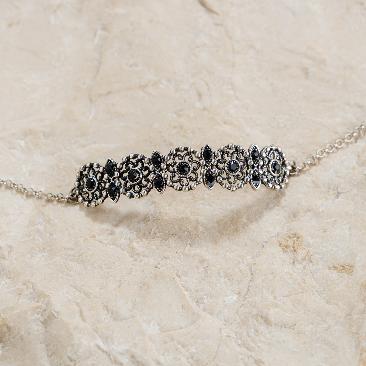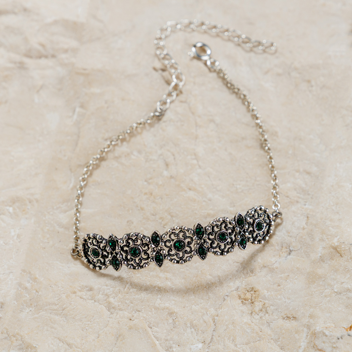 Modelul ornamental creează iluzia unei dantele metalice, unde fiecare floare este prinsă într-un dans geometric perfect. Piatra centrală a fiecărei forme nu e doar decorativă - e inimă, e punct de echilibru.