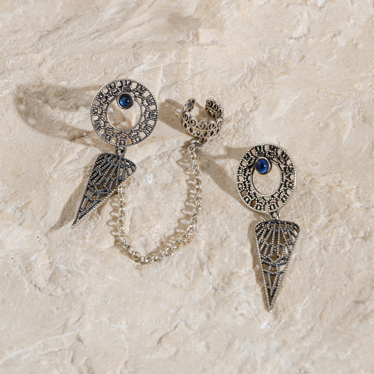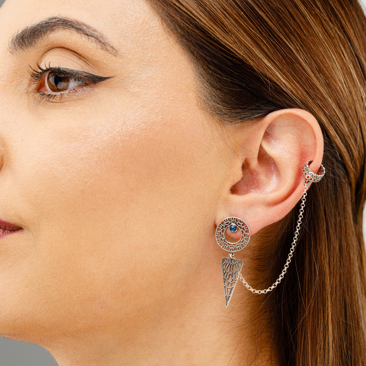 Se introduce cercelul principal (cel rotund, cu pietre și pandantiv triunghiular) ca un cercel normal, prin lobul urechii.