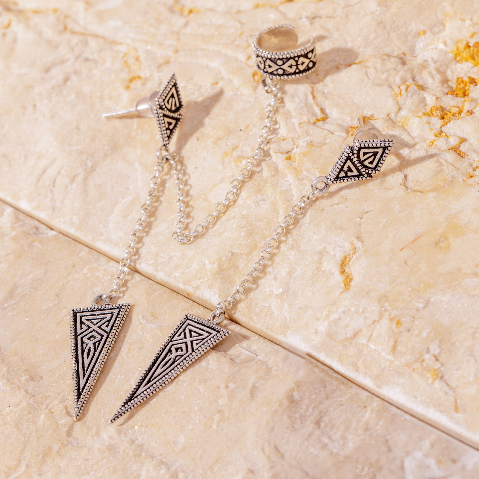 Geometria clară – triunghiuri, romburi, axe simetrice – evocă rigoarea liniilor sculptate în piatră și ordinea cosmosului. Fiecare detaliu gravat pe argintul oxidat vorbește despre echilibru, forță interioară și identitate neclintită.