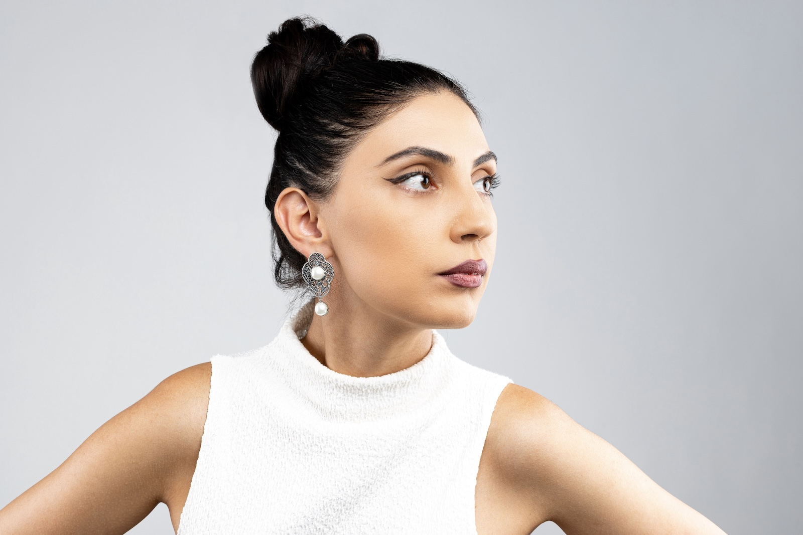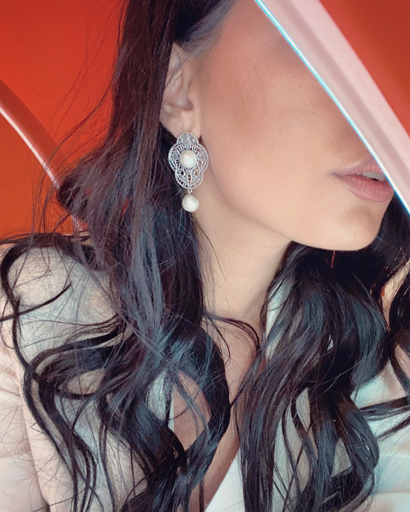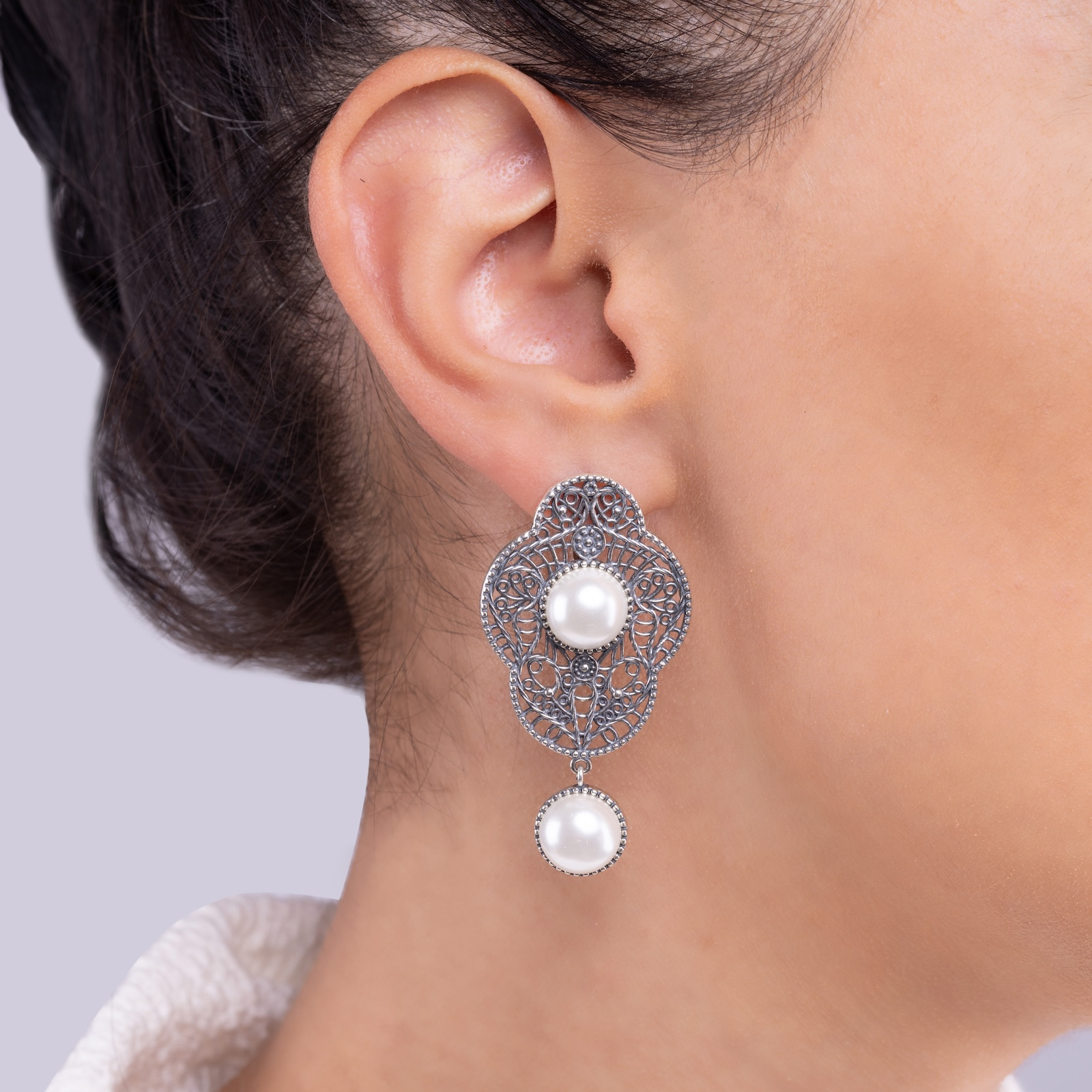 Designul lucrat cu migală în argint filigranat amintește de broderiile regale și de arhitectura solemnă a curților vechi. Cele două perle – una în centru, una suspendată – sunt ca două embleme ale echilibrului: statornicie și mișcare, autoritate și grație.