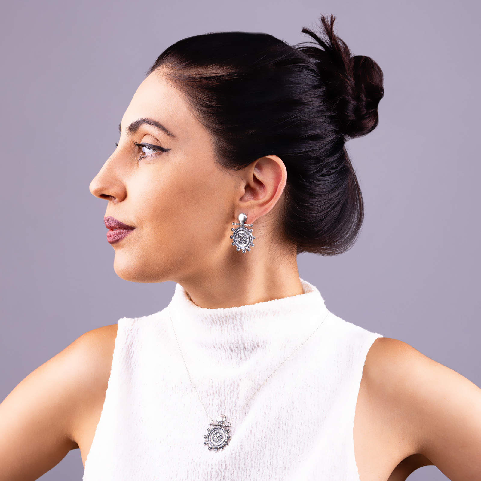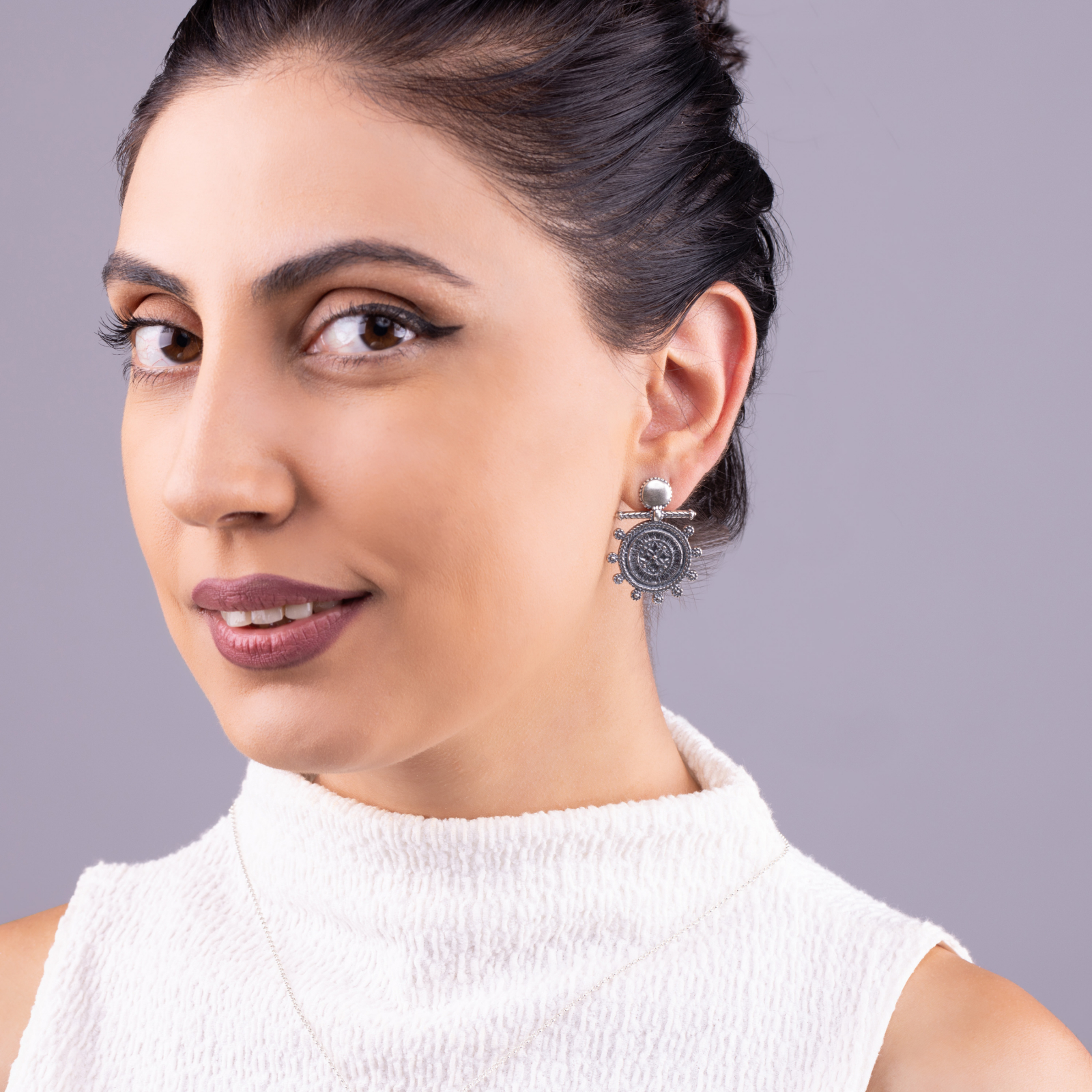 Designul acestor cercei evocă un scut regal miniatural: margini cu detalii în relief, centru gravat cu un motiv geometric și o tărie sculpturală care amintește de vechile amulete de luptă și onoare.