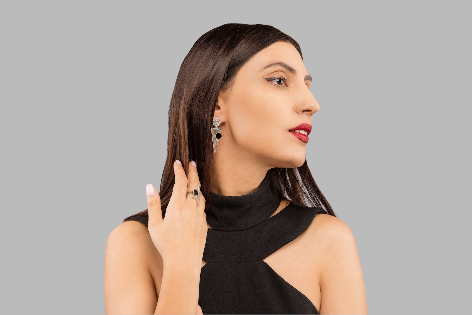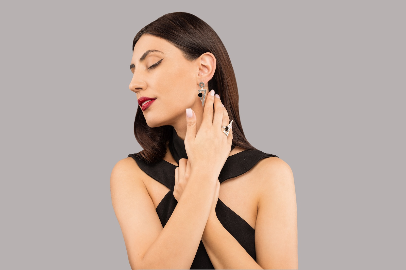 Onixul aduce profunzime și protecție, dar aici e mai mult: devine accentul unei geometrii ritualice, al unui limbaj vizual care vorbește în tăceri.
