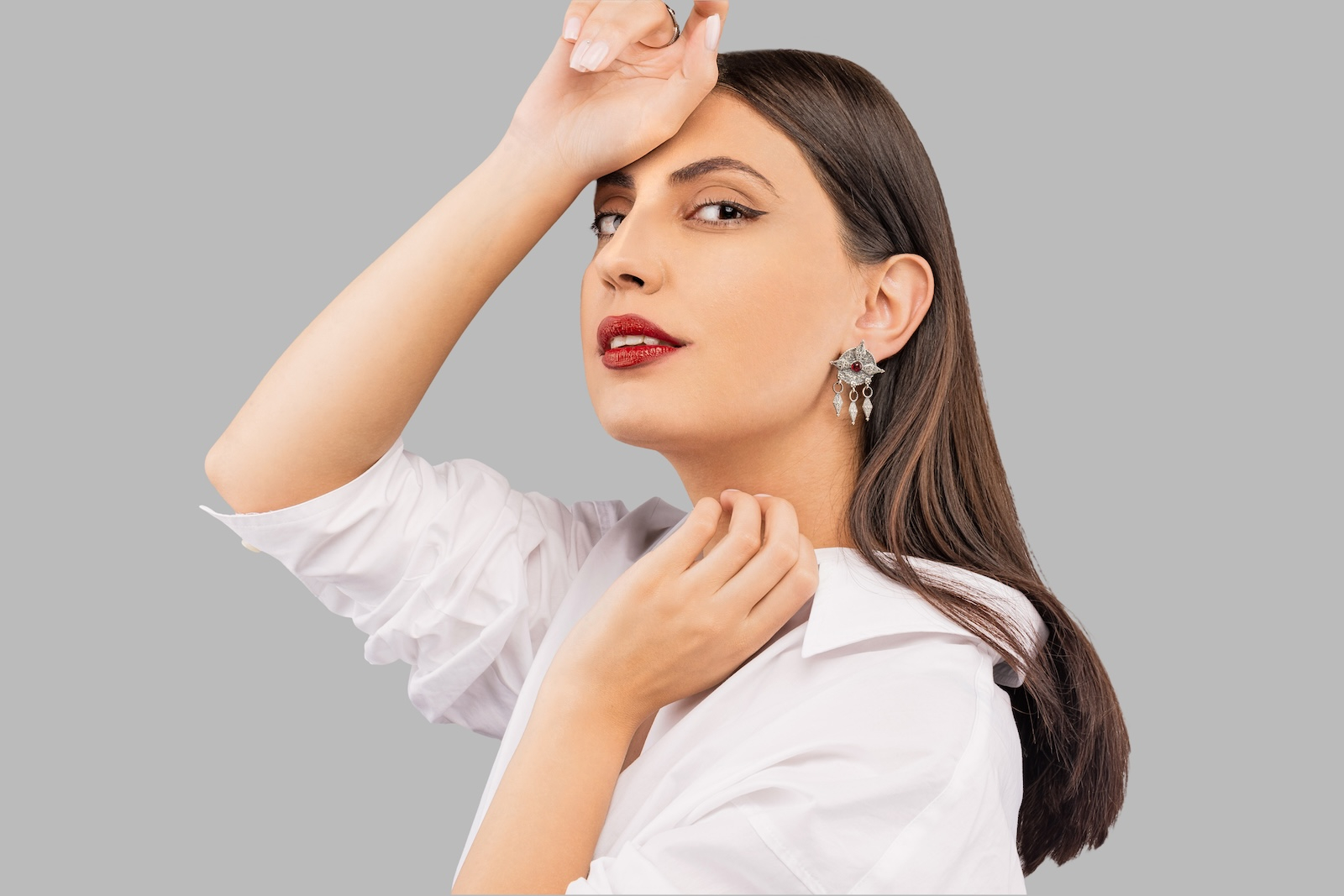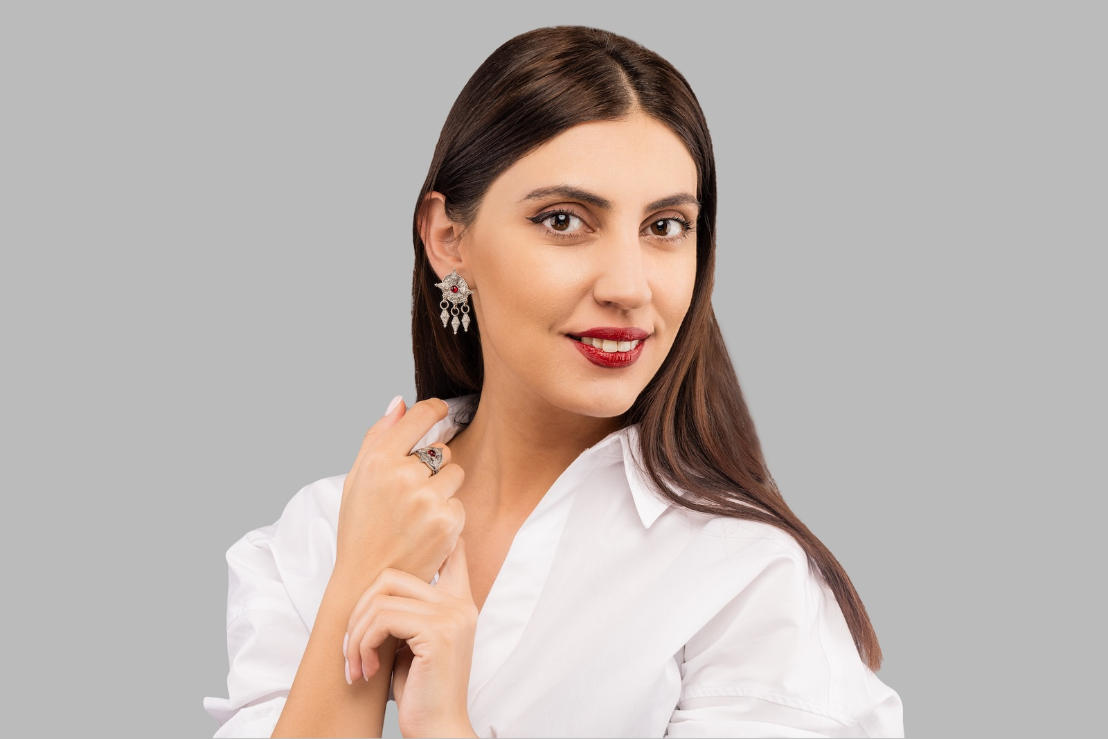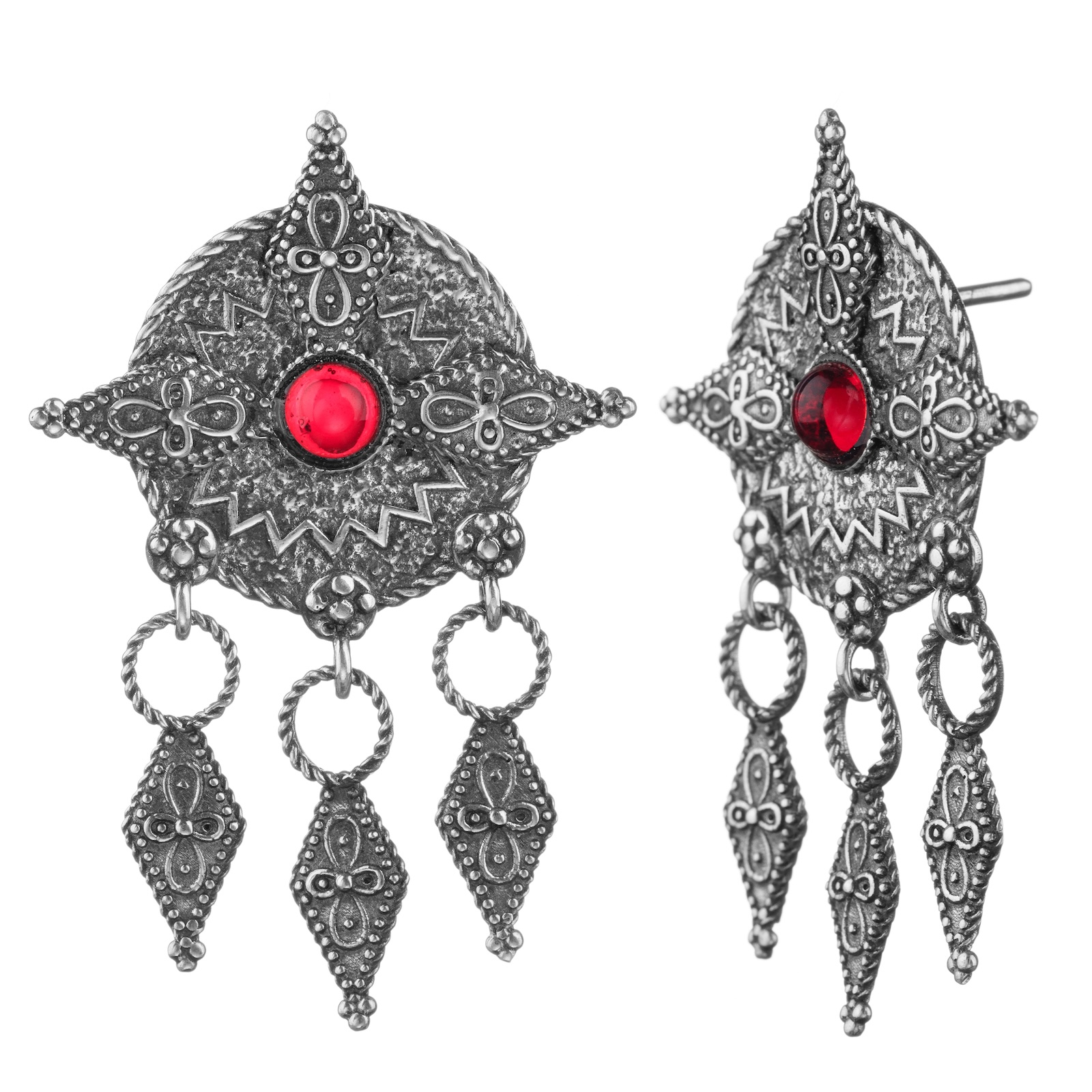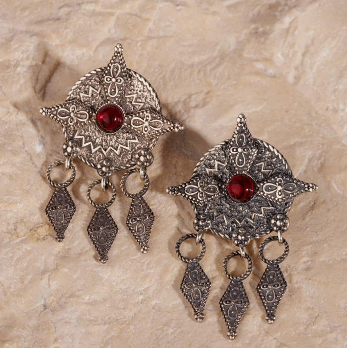 Cerceii Arení sunt lucrați manual, cu un design inspirat din simbolurile armenești tradiționale. Modelul central este completat de detalii mobile, iar piatra roșie din mijloc adaugă contrast și ritm compoziției.