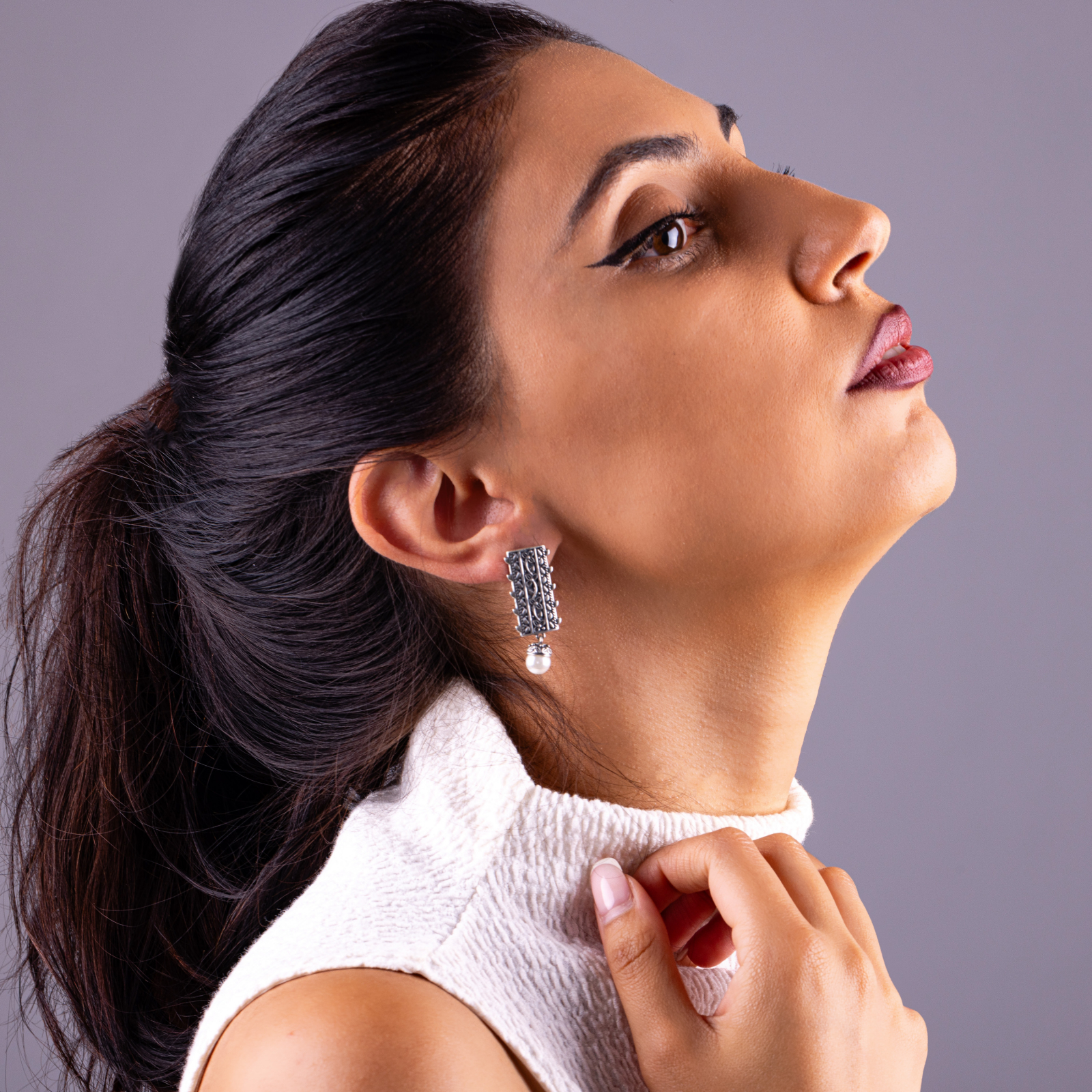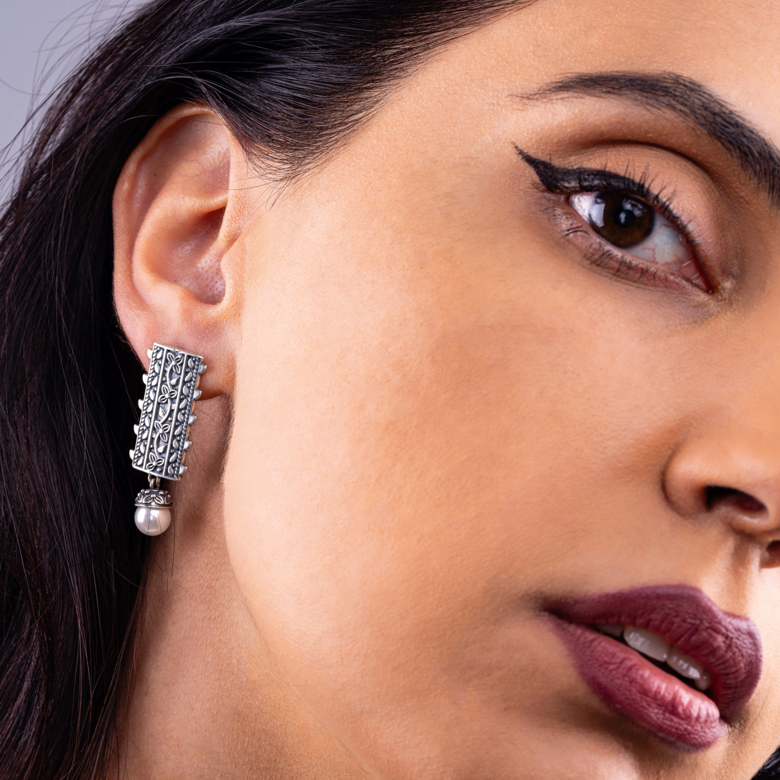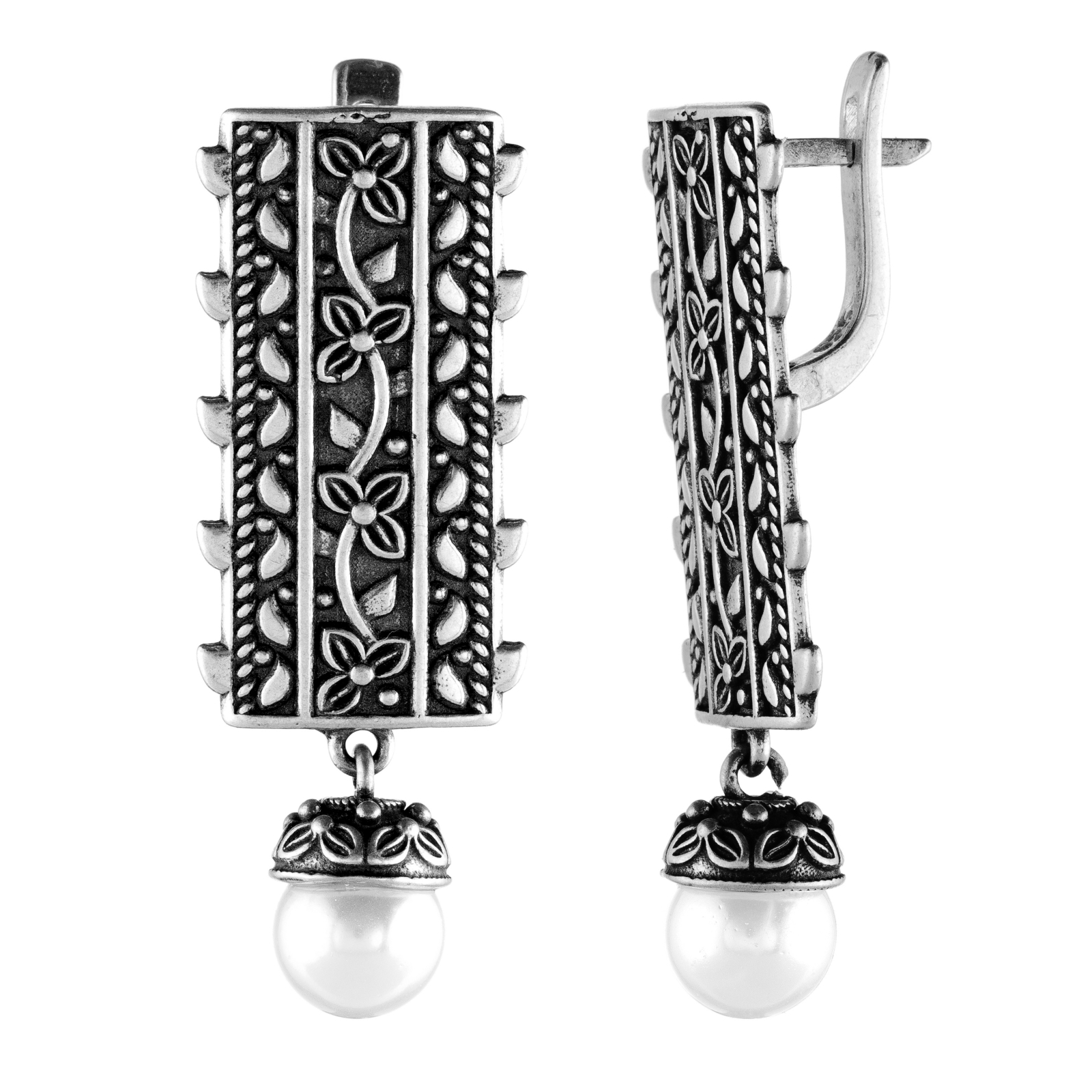 Argint sculptat în linii florale verticale, cu o perlă albă suspendată ca o picătură de lumină. Designul vorbește despre feminitate calmă, despre tăcerea care se face remarcată, despre frumusețea care nu are nevoie de volum.