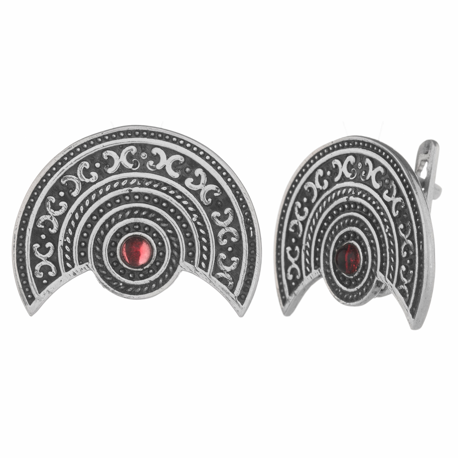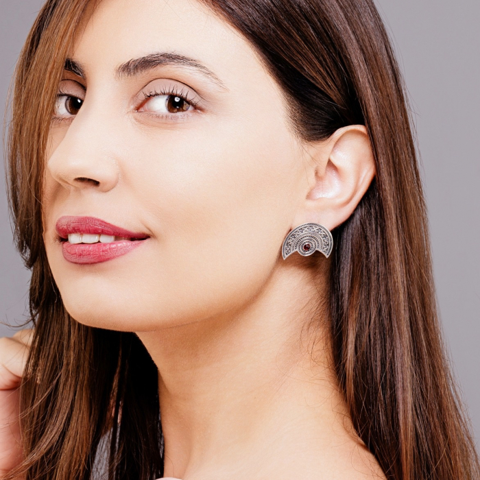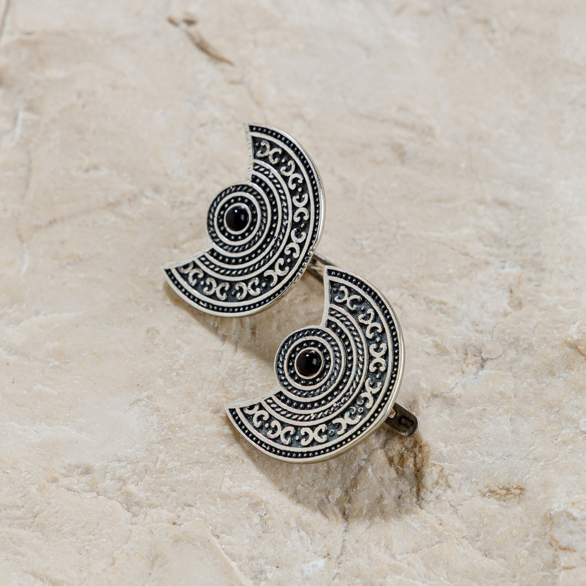 Acești cercei discreți dar expresivi sunt modelați sub forma unui semicerc elegant, gravat fin și centrat de o piatră cu caracter. Inspirat de simbolul ochiului - privirea interioară, intuiția, protecția –
