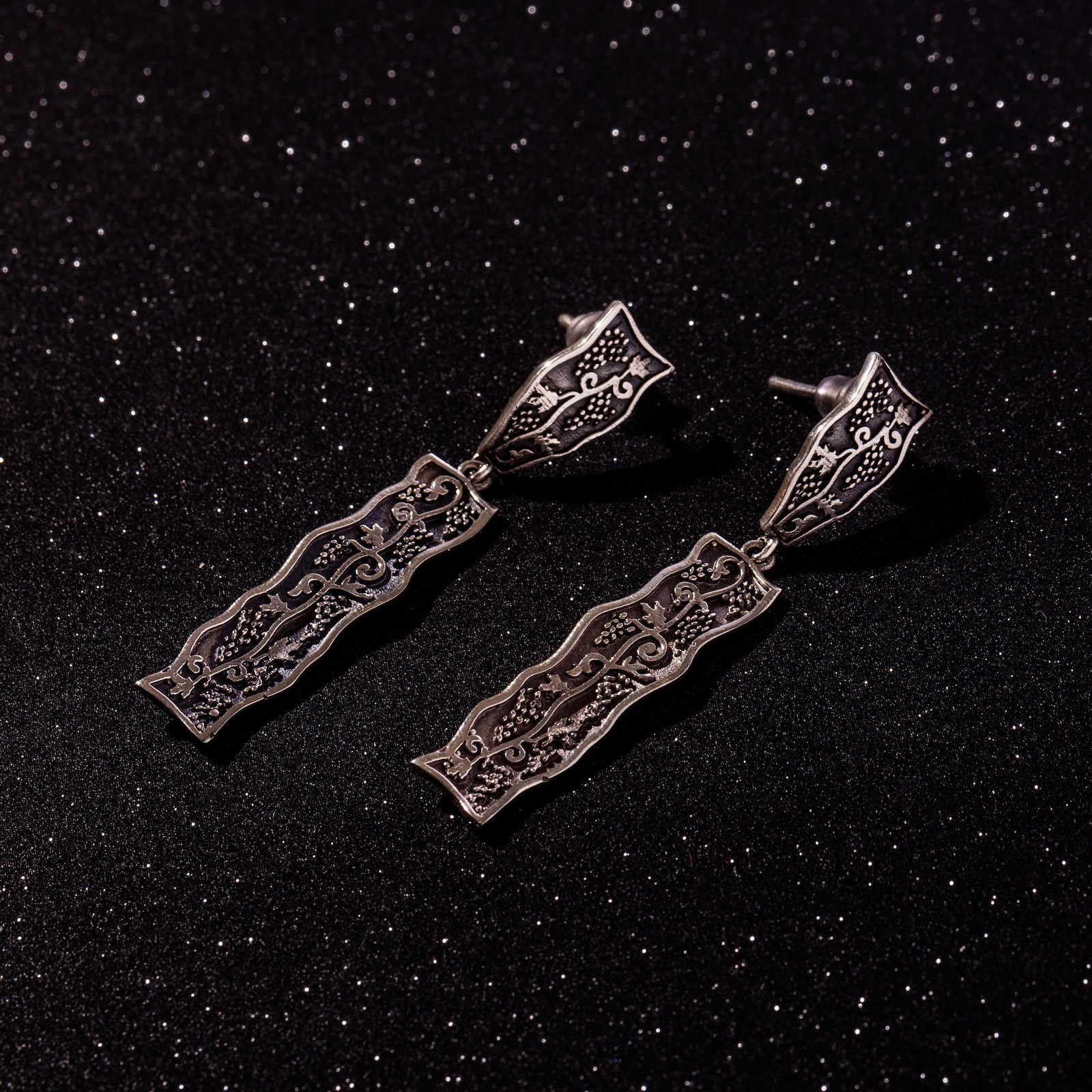 Acești cercei surprind exact acest echilibru: detalii gravate fin, ce amintesc de ramuri și ciorchini, într-o formă alungită și elegantă.