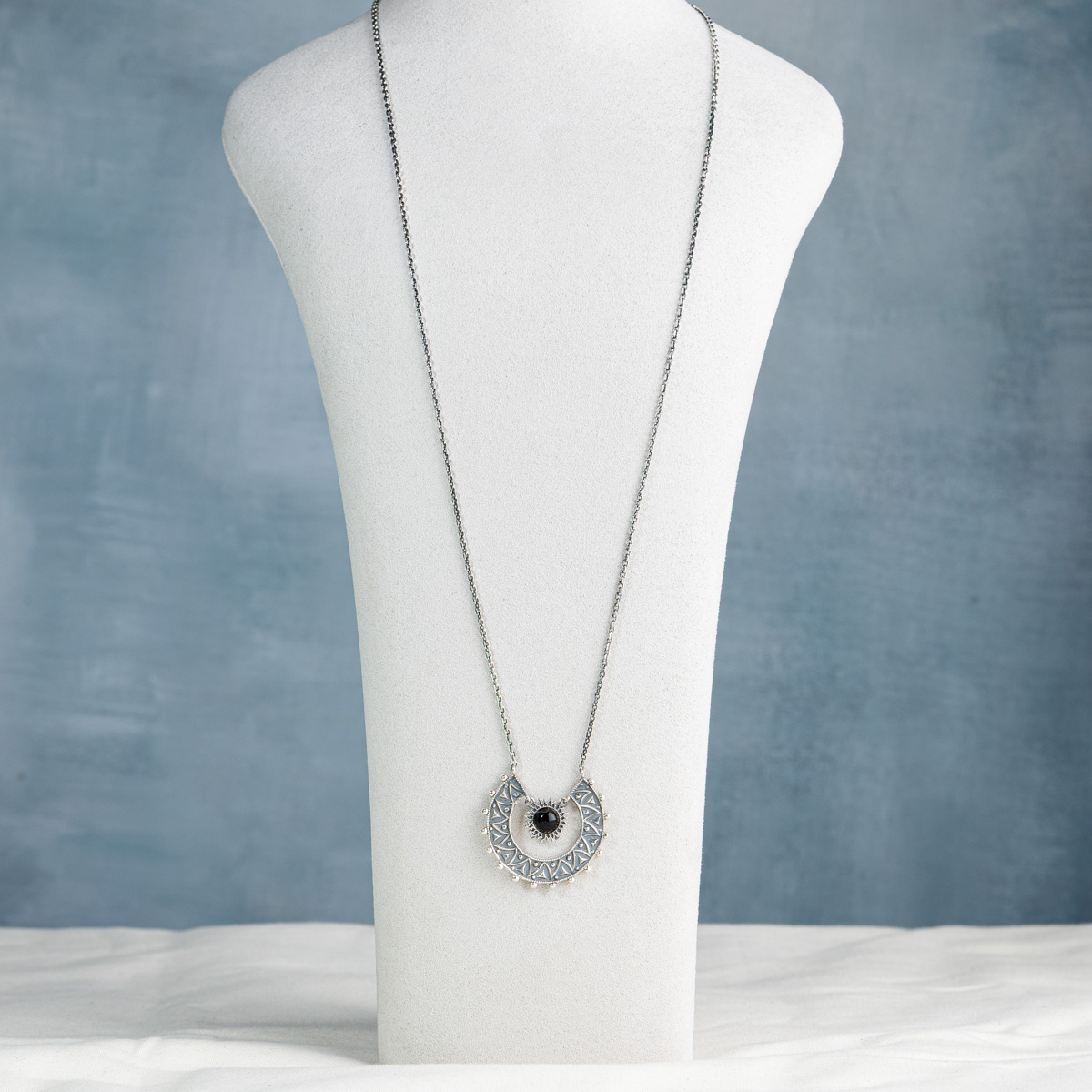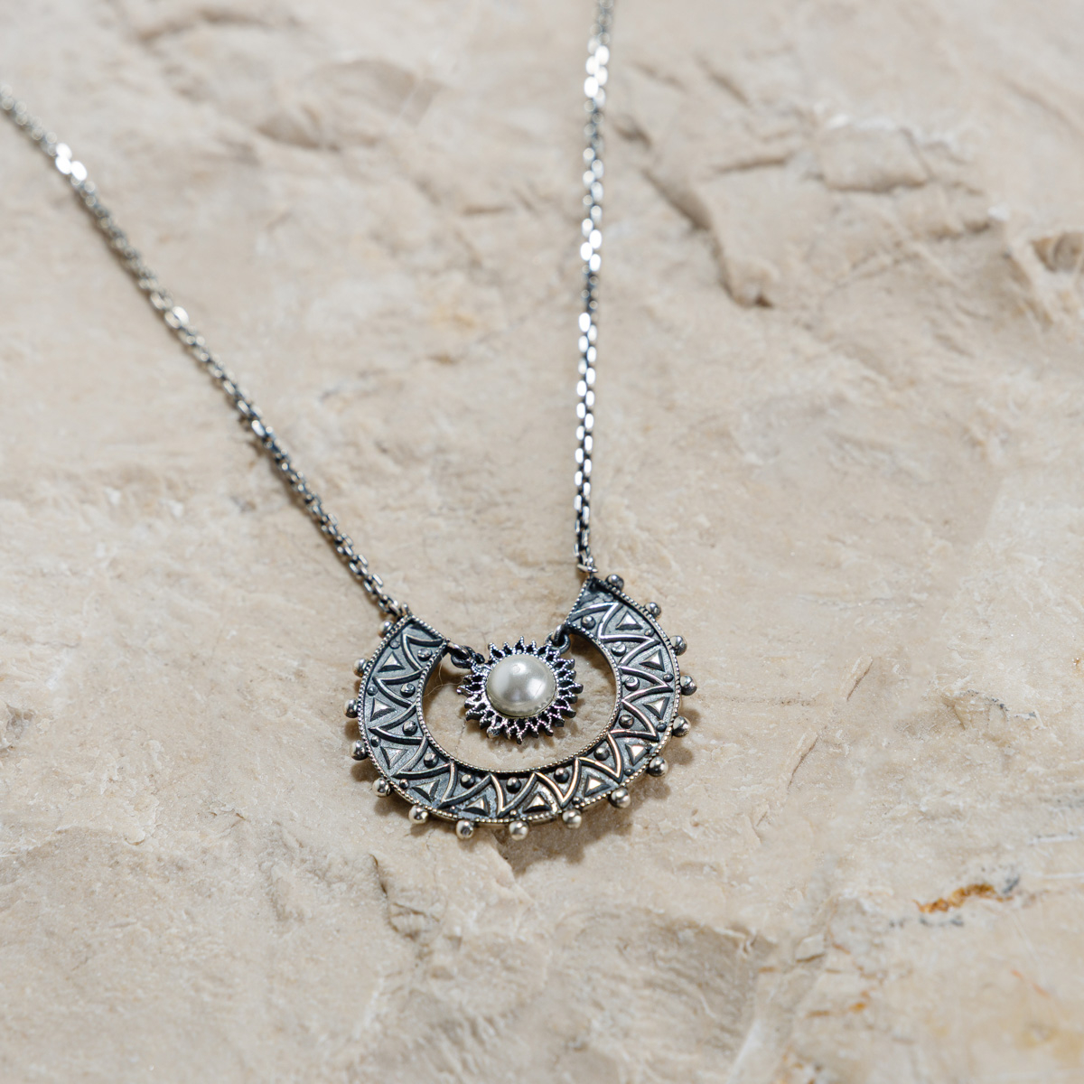 Realizat manual din argint 925, colierul Epige îmbină formele geometrice inspirate din arta armeană antică cu un element central - perlă sau piatră neagră, fiecare cu propria energie: luminoasă și calmă sau profundă și protectoare. Designul semicircular, decorat cu motive fine, evocă echilibrul dintre forță și delicatețe.