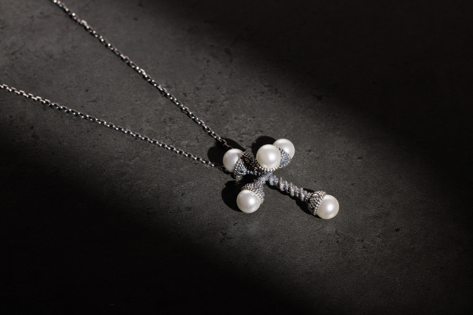 Textura decorativă, lucrată în detalii minuscule, contrastează cu netezimea perlelor, creând o armonie între forță și grație.