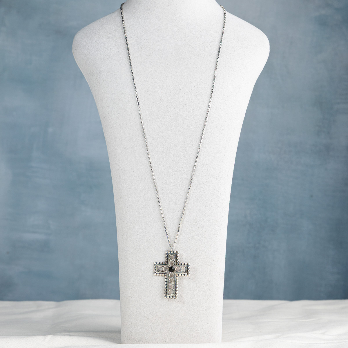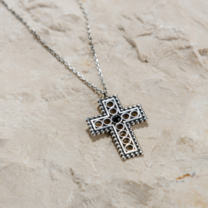 Designul crucii reflectă această moștenire: motive circulare și mărgele din argint 925 creează o compoziție echilibrată, cu un centru care unește cele patru direcții - simbol al armoniei și al legăturii dintre cer și pământ.