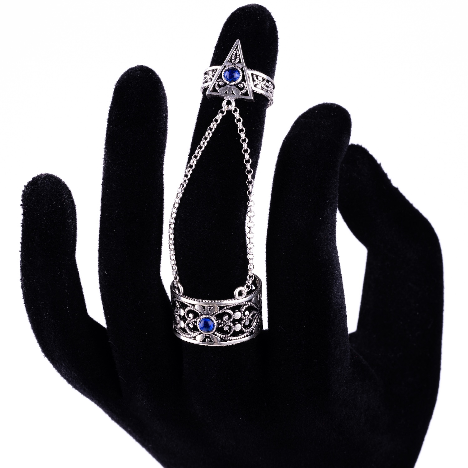 Cele două verigi, unite printr-un lanț delicat, evocă sensul unui drum care nu se întrerupe. Partea rotundă reprezintă roata vieții, înflorită cu motive florale, iar capătul triunghiular – săgeata – străpunge timpul și spațiul, arătând direcția inimii. Piatra centrală, de un albastru profund, pare un ochi tăcut ce veghează.
