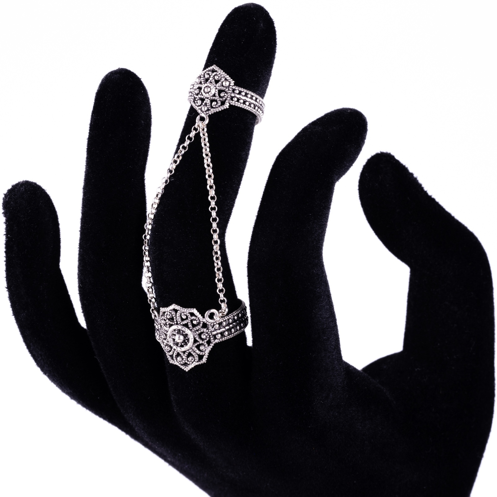 Cele două verigi sunt ornate cu detalii fine, în relief, unite printr-un lanț dublu care adaugă o notă de mișcare și echilibru vizual. Central, motivul floral stilizat și structura octogonală evocă mandale sau sigilii antice.