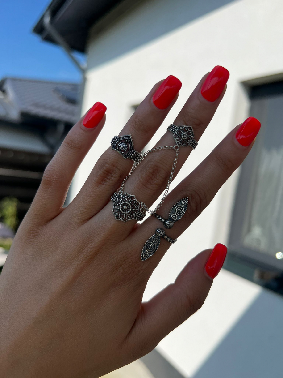 După ce ambele verigi sunt fixate, glisați cu grijă veriga mare până la baza degetului, astfel încât lanțul să se întindă ușor și să cadă elegant între cele două verigi, fără a crea tensiune.