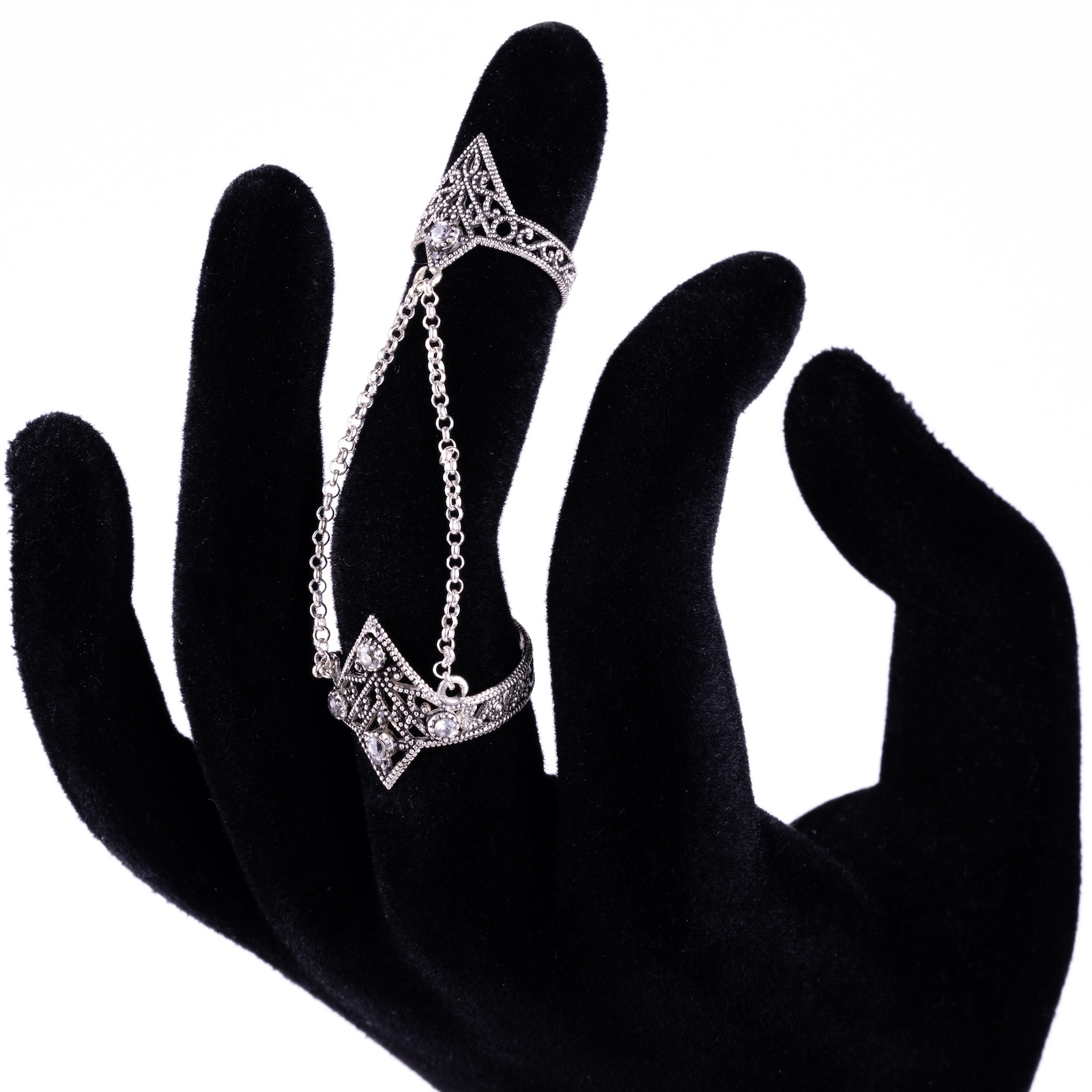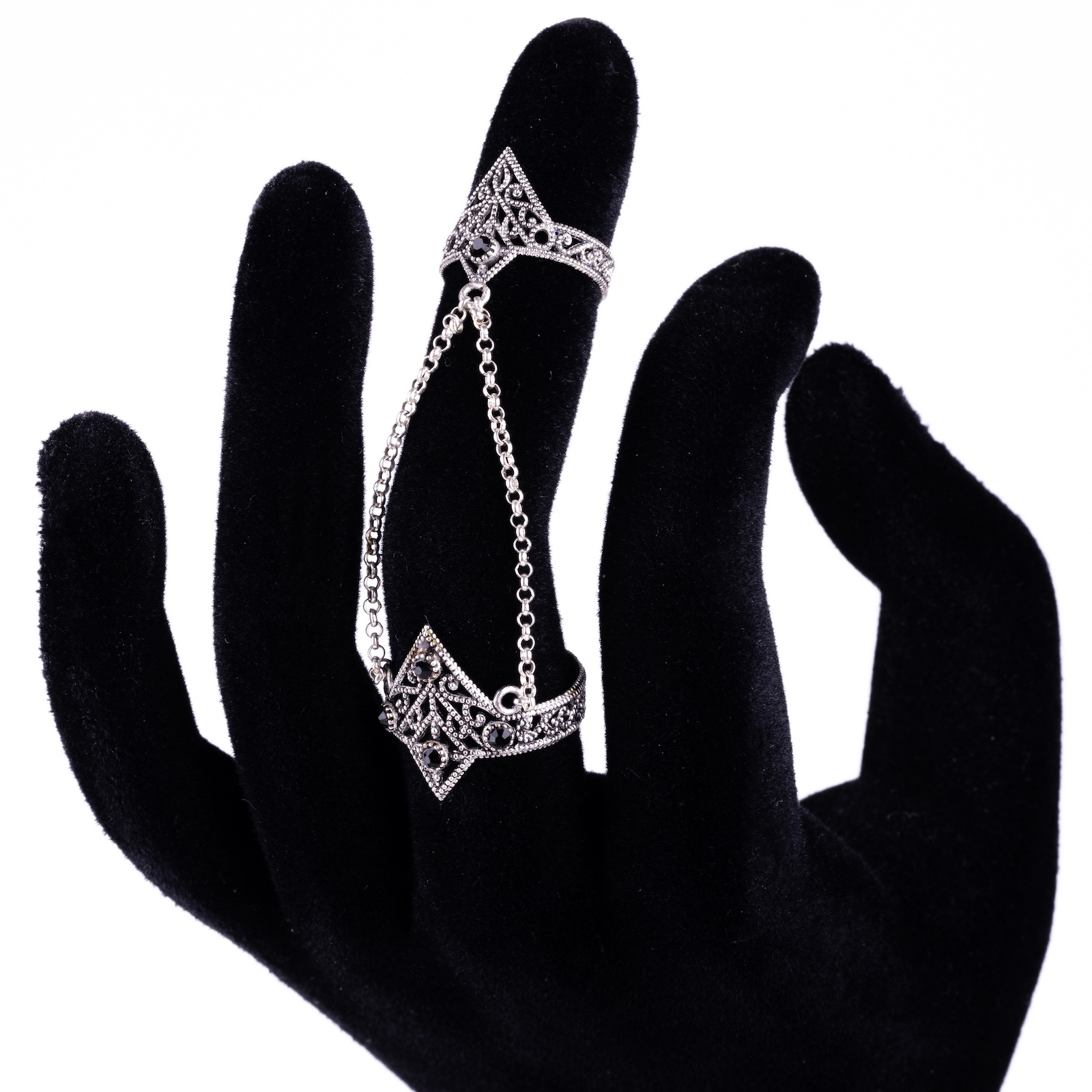 După ce ambele verigi sunt fixate, glisați cu grijă veriga mare până la baza degetului, astfel încât lanțul să se întindă ușor și să cadă elegant între cele două verigi, fără a crea tensiune.