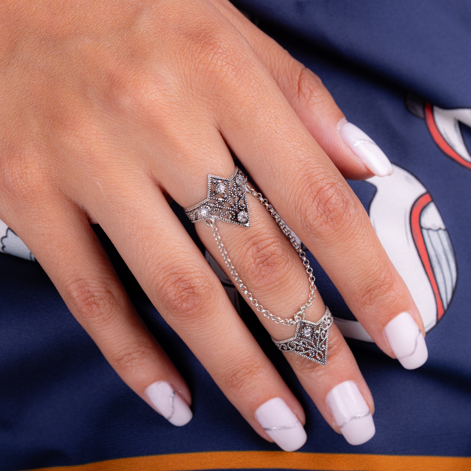 Inelul cu lanț Nahșe poartă un model fluid și simetric, inspirat de simboluri orientale reinterpretate în cheie contemporană. Numele său provine din cuvântul armenesc nahș (ornament), și exact asta exprimă: o frumusețe care nu doar decorează, ci comunică.