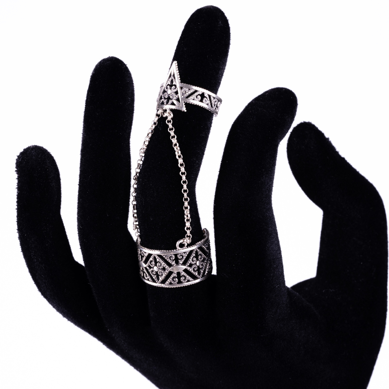 După ce ambele verigi sunt fixate, glisați cu grijă veriga mare până la baza degetului, astfel încât lanțul să se întindă ușor și să cadă elegant între cele două verigi, fără a crea tensiune.