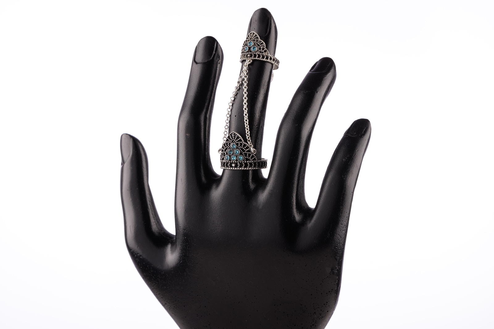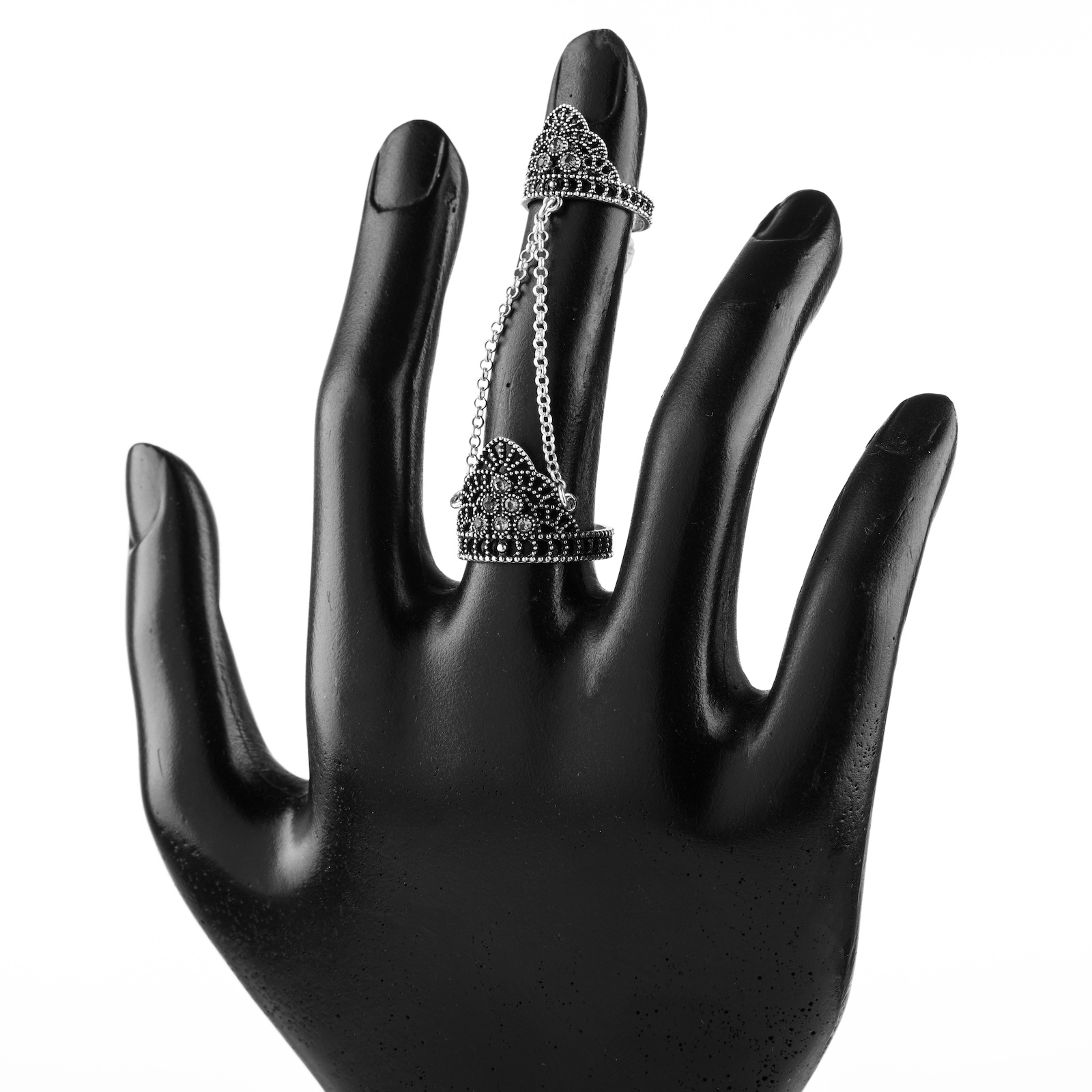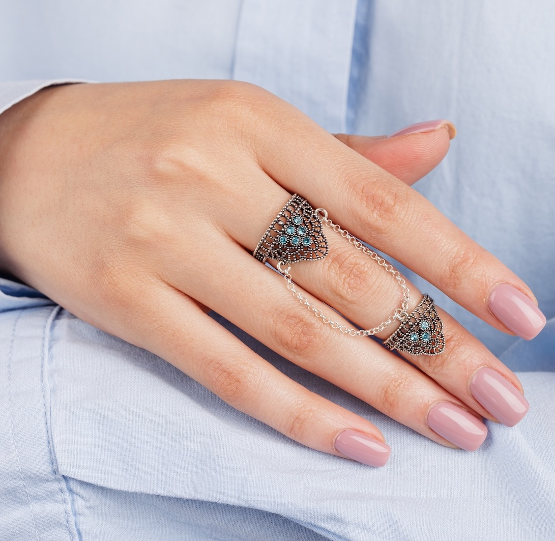 După ce ambele verigi sunt fixate, glisați cu grijă veriga mare până la baza degetului, astfel încât lanțul să se întindă ușor și să cadă elegant între cele două verigi, fără a crea tensiune.