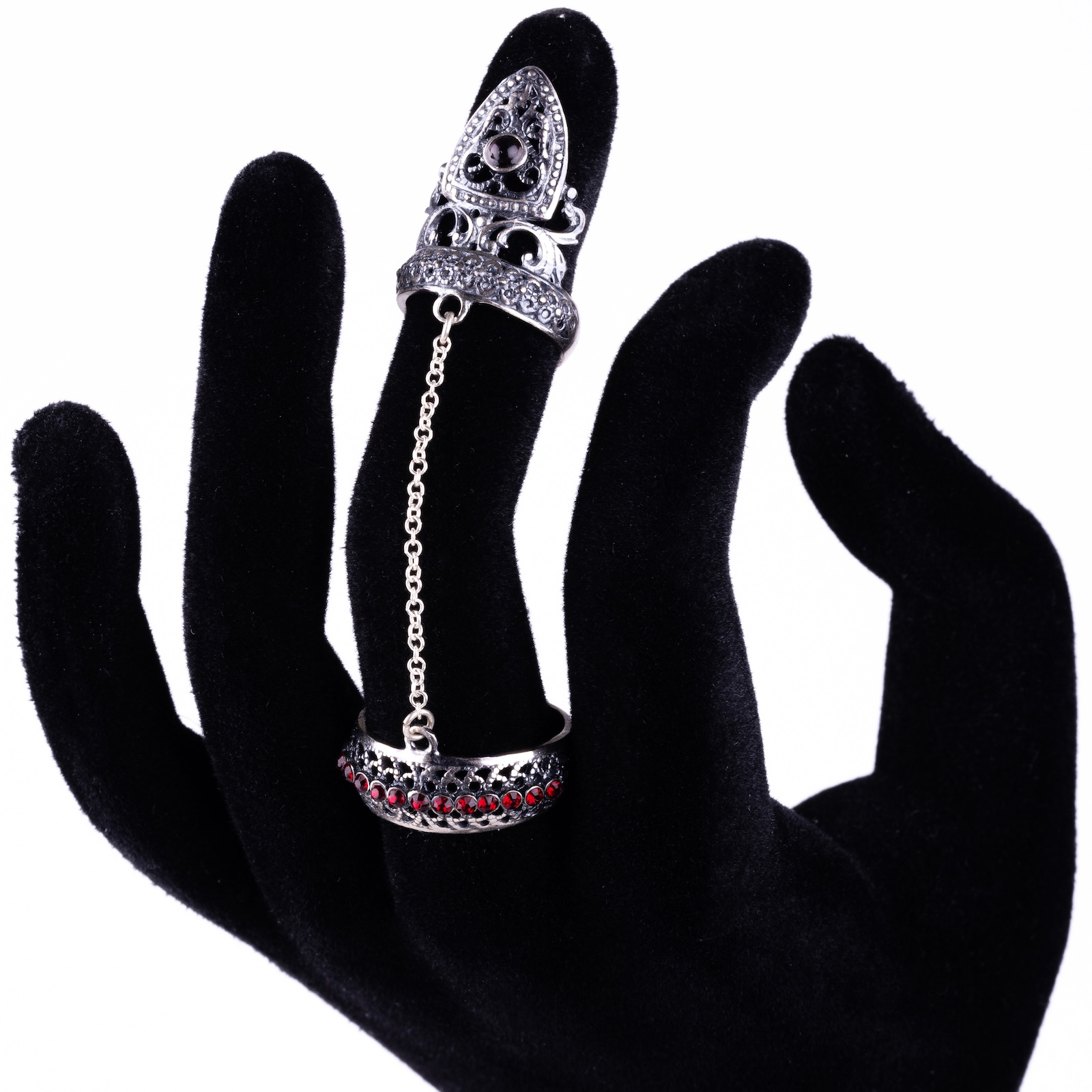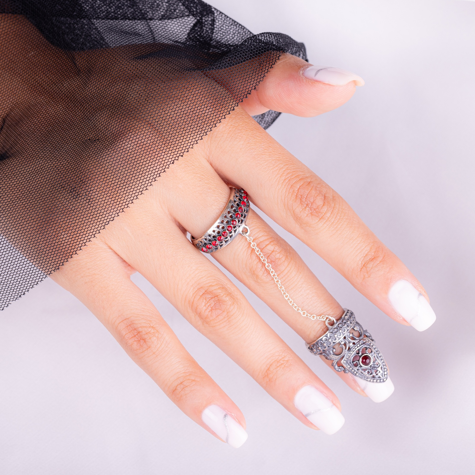 Cele două verigi sunt unite printr-un lanț fin, oferind o armonie subtilă între delicatețe și autoritate. Este o piesă de contrast: ornamentală, dar puternică; feminină, dar impunătoare.
