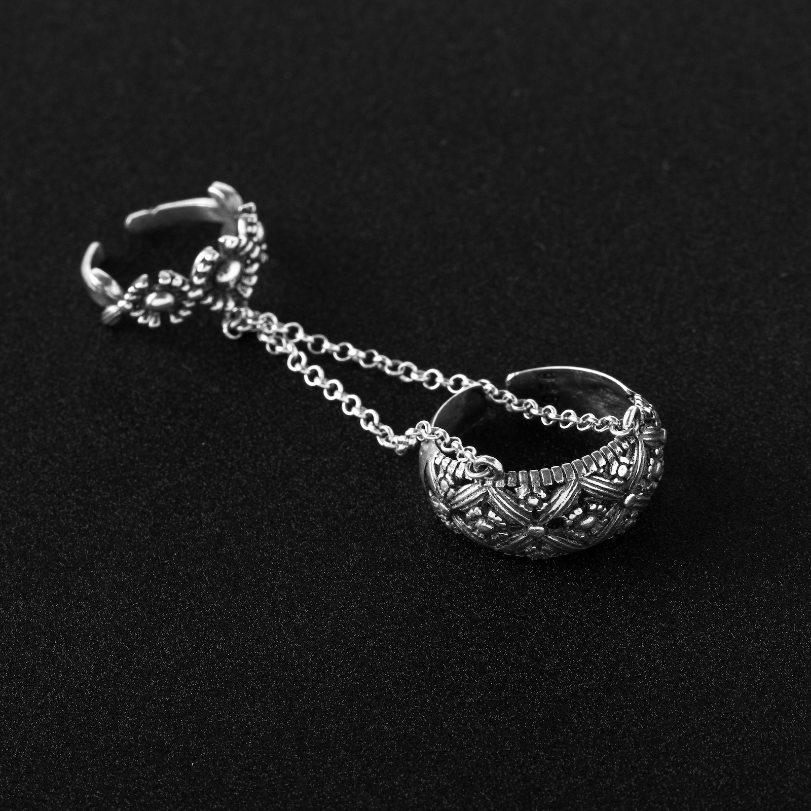 Nane, acest inel statement vorbește fără cuvinte. Două verigi unite printr-un lanț delicat creează un echilibru subtil între forță și grație.