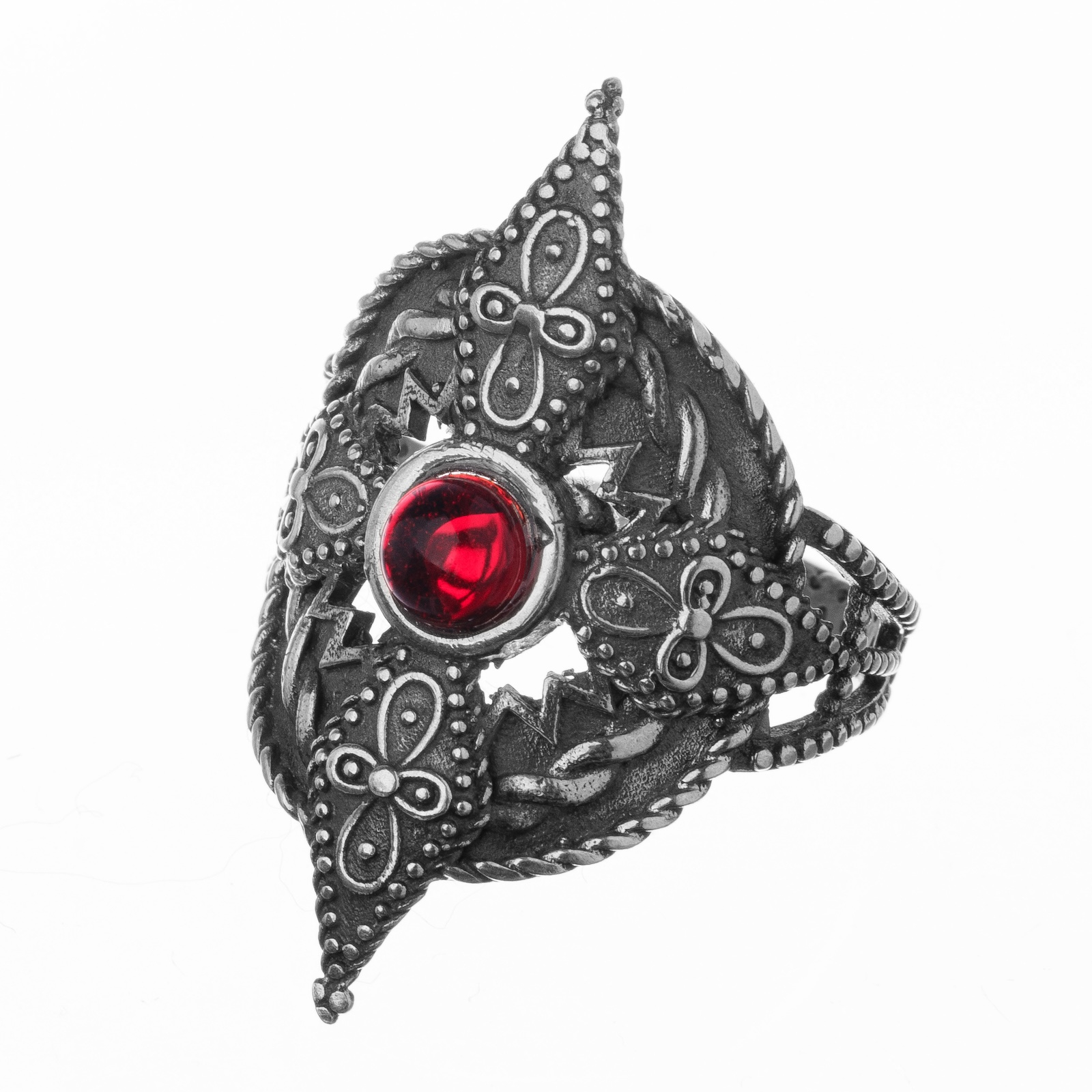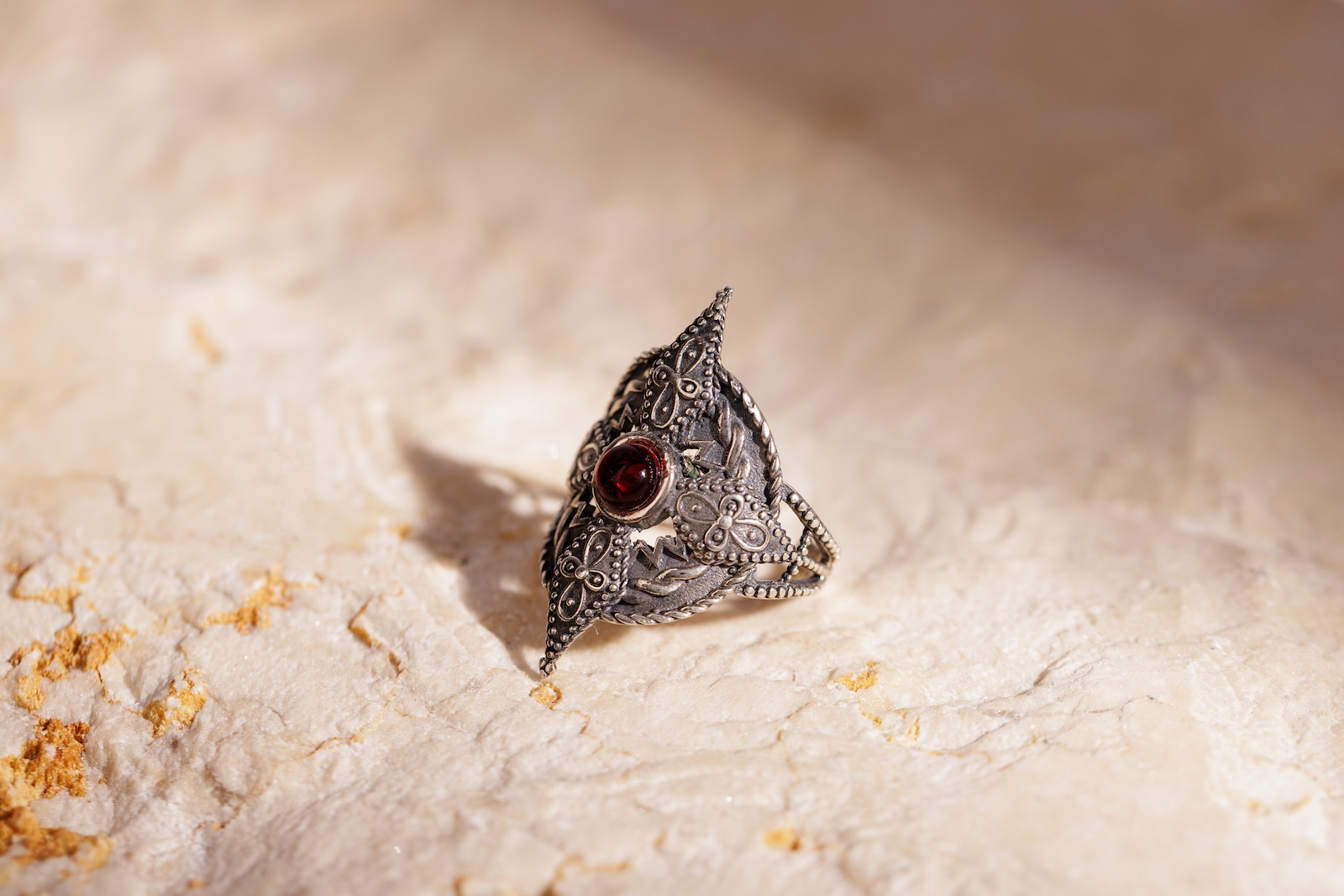 Inelul Arení are un design alungit și elemente decorative inspirate din motive armenești tradiționale. În centrul compoziției se află o piatră roșie, montată pe o structură fin lucrată, bogată în detalii.