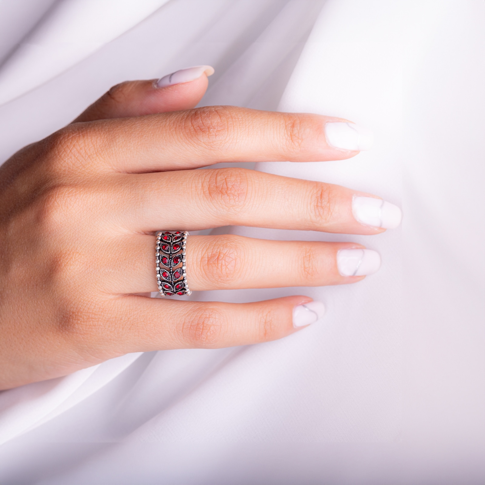 Lore este o colecție de inele care transformă natura în bijuterie sculpturală. Modelul ornamental, inspirat din frunze de tei (Lori sau Loreni în armeană), este lucrat cu migală în argint 925 și decorat cu pietre fine – verde sau roșu, în funcție de energia purtată.