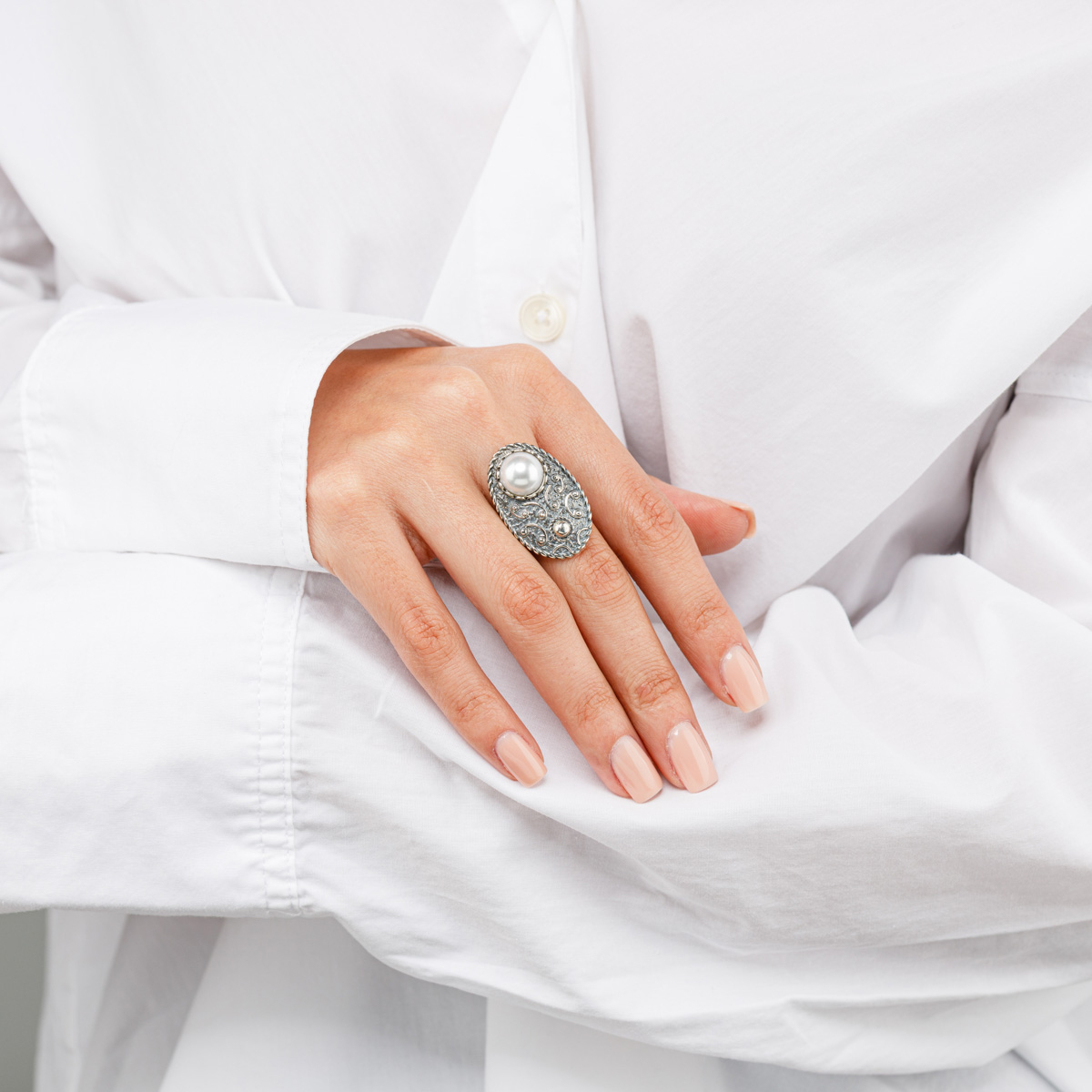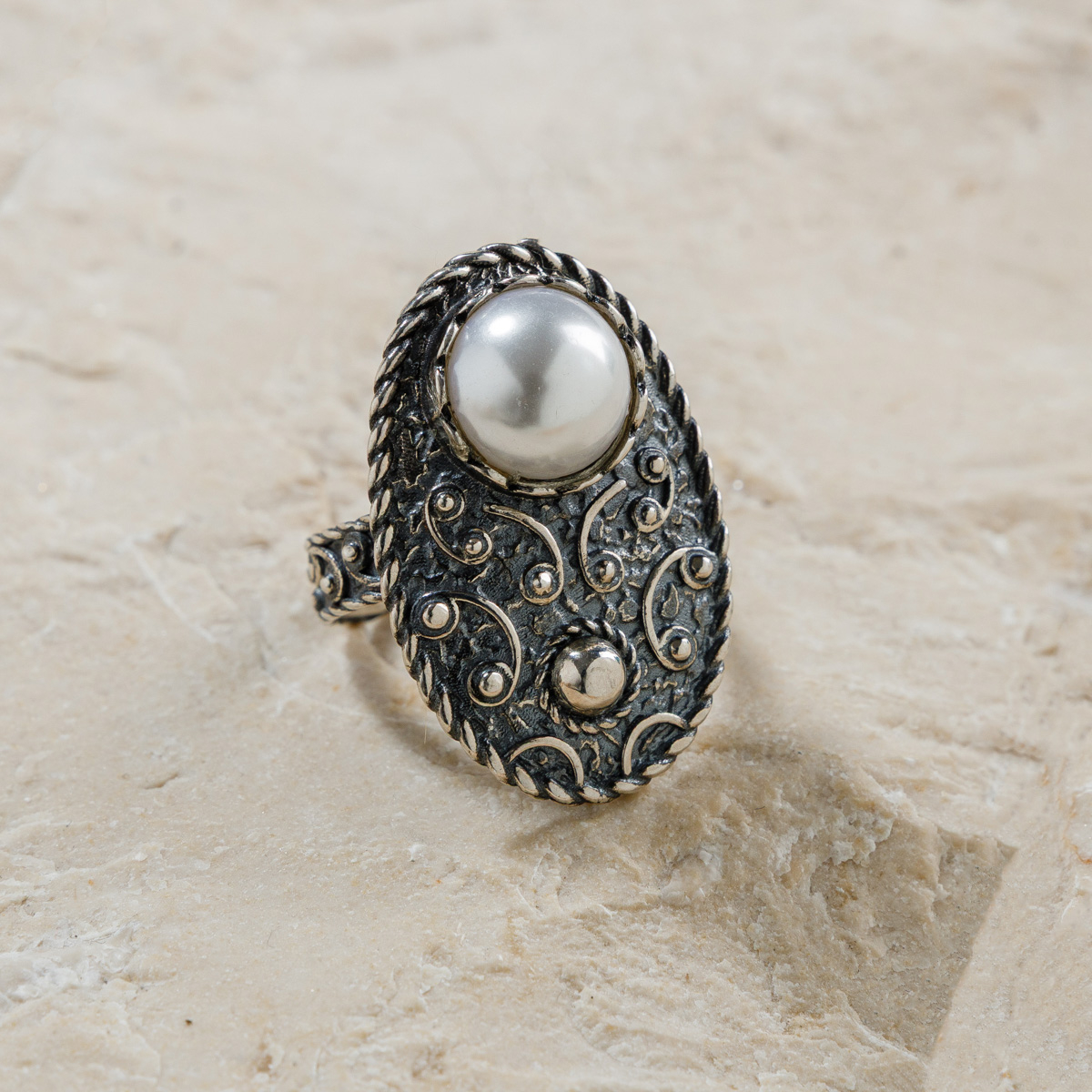Designul inelului reflectă această forță calmă: o piesă amplă, cu detalii inspirate din ornamentica medievală armenească și o perlă centrală care amintește de demnitatea și echilibrul reginei. Forma sa alungită și lucrătura atentă îi conferă un aer regal, potrivit unei femei care a fost atât conducătoare, cât și protector al culturii și credinței.