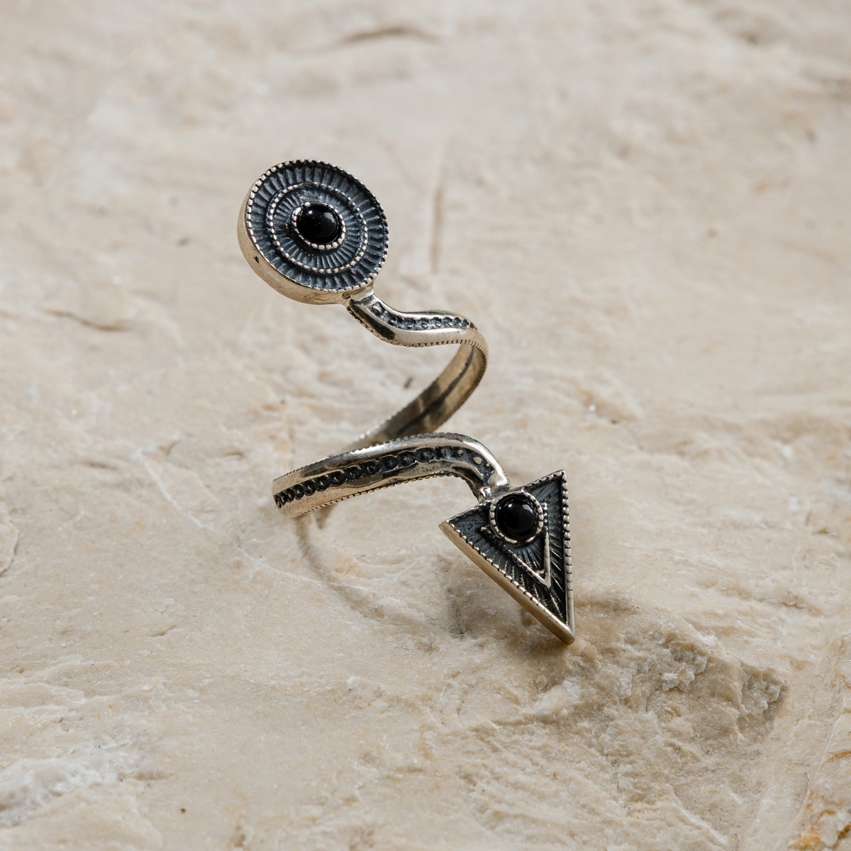 Inelul Săgeata Zeiței poartă în el o poveste fascinantă: când cerul atingea munții Armeniei și legendele erau scrise în piatră, o zeiță a trimis o săgeată din lumină spre pământ. Acolo unde a căzut, a înflorit un simbol - o floare solară cu inimă de piatră. Acest inel este ecoul acelei povești: două capete unite printr-o linie vie, curgătoare, ca destinul însuși.