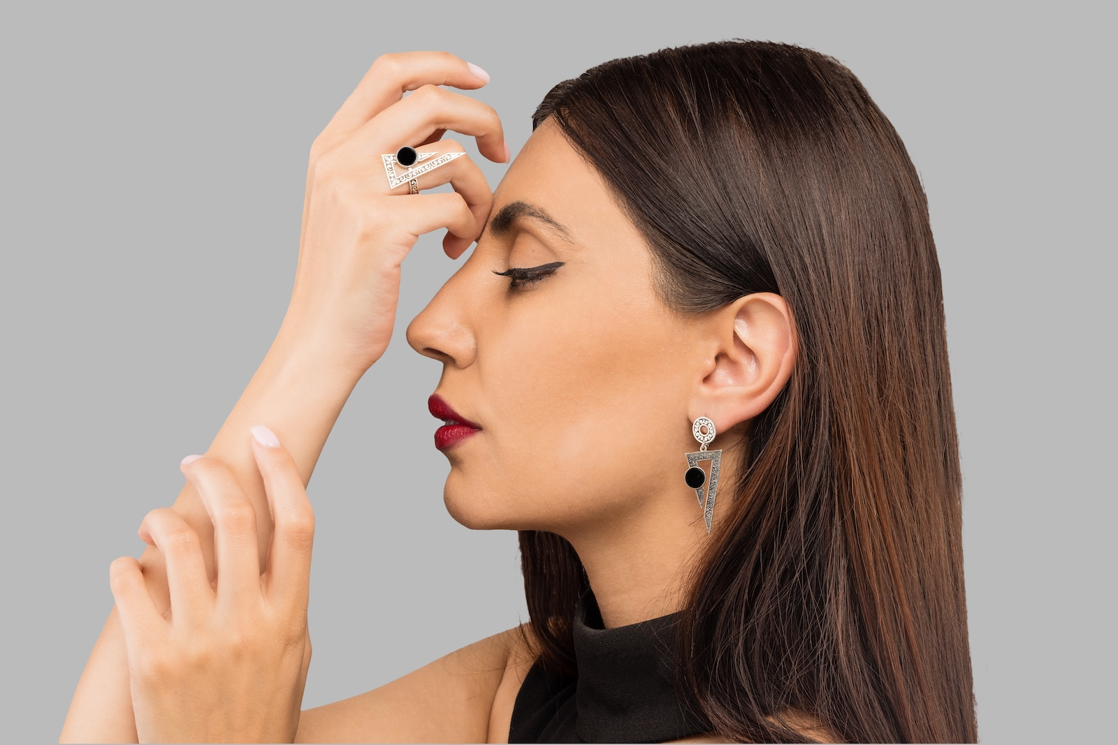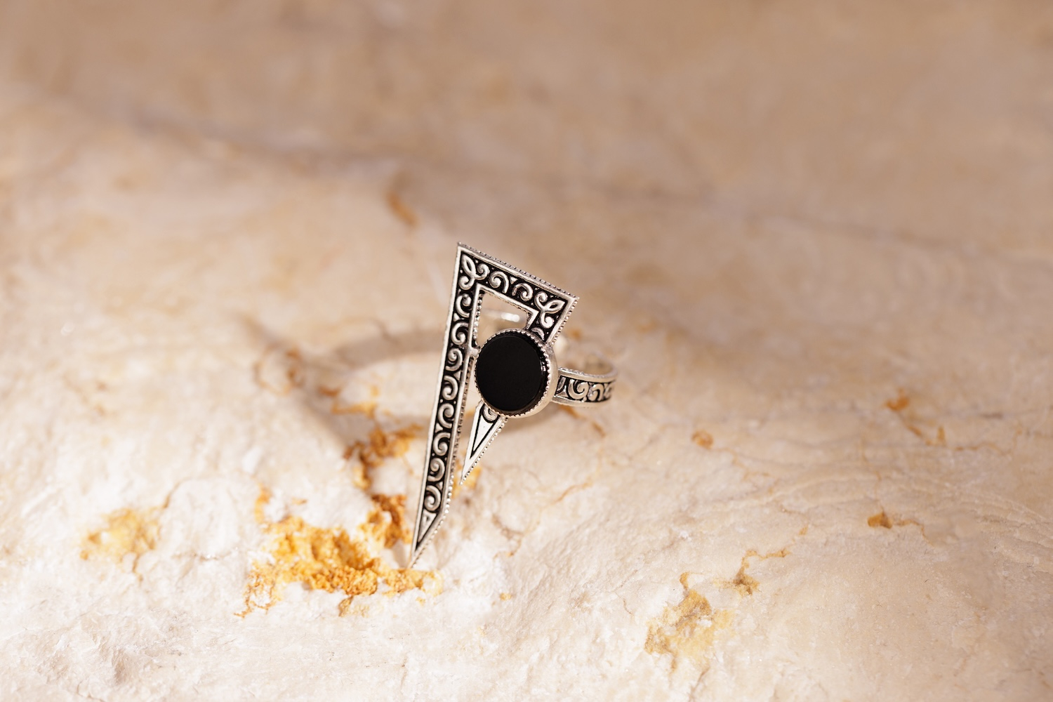 Akorí – acolo unde muntele începe să șoptească. Inspirat de satul legendar aflat la poalele muntelui Ararat, locul unde a coborât Arca lui Noe, acest inel nu e doar bijuterie – e relicvă. Linia sa tăioasă, unghiulară, e o amintire a formei muntelui – abruptă, sacră, imposibil de ignorat. În centrul designului stă onixul, piatră cu o istorie adâncă în regiunea Araratului, unde se găsește în forme naturale spectaculoase.