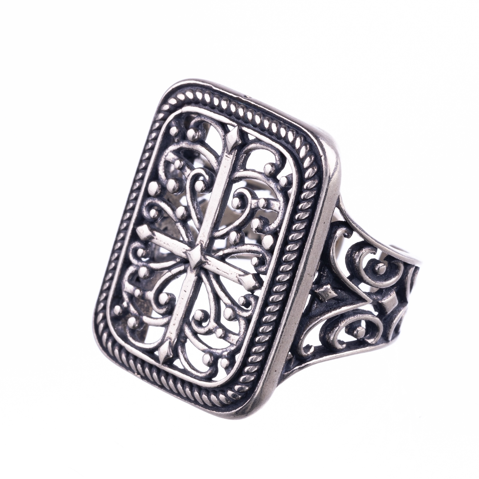 Textura oxidată și finisajele atent lucrate transformă piesa într-un obiect de patrimoniu purtabil – o bijuterie care îmbină estetica sacră cu eleganța modernă.