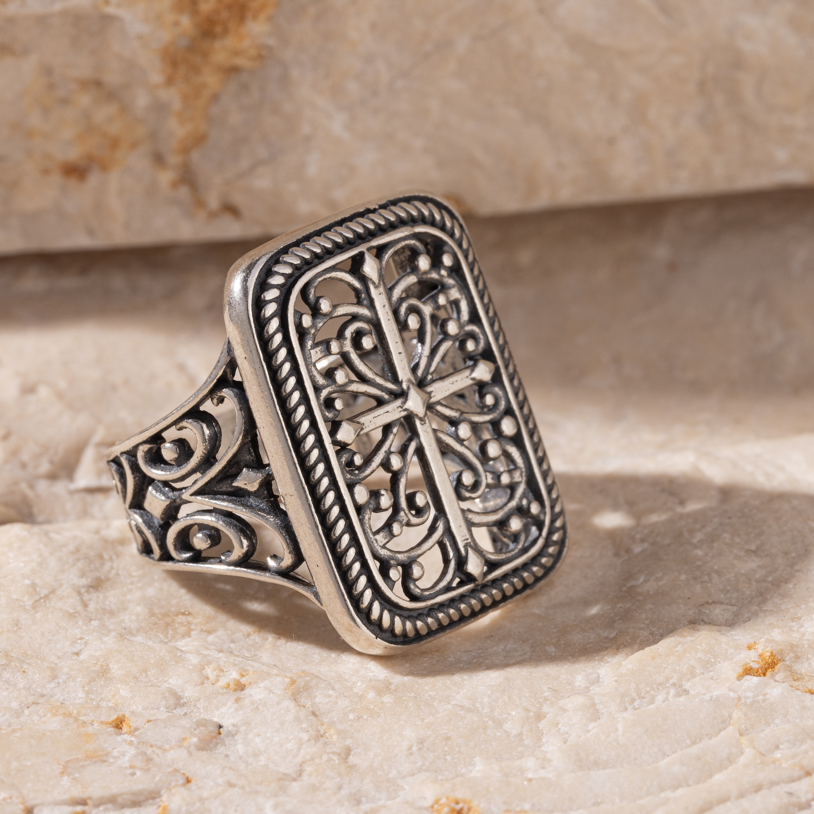 Avetis este mai mult decât un inel – este o relicvă personală. Inspirat de simbolistica khachkar-urilor armenești (cruci tradiționale sculptate în piatră), designul său rectangular aduce în prim-plan o cruce centrală lucrată cu atenție, înconjurată de detalii arhitecturale fine.