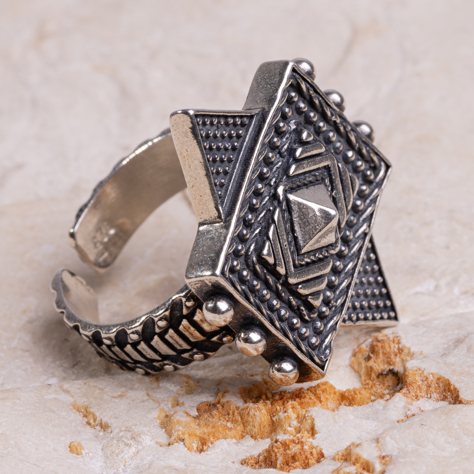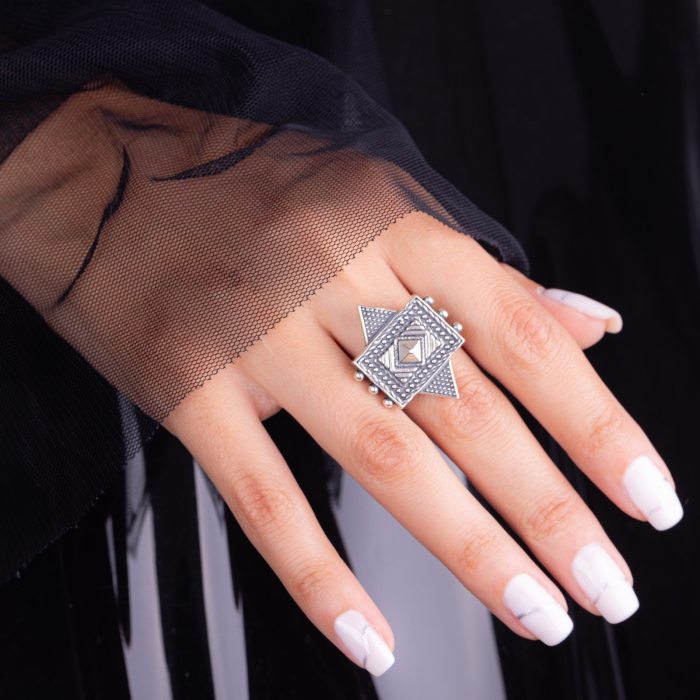 Garní – simbolul rezistenței antice, transpus în argint. Inspirat de arhitectura unică a Templului Garni din anul 77, singurul templu păgân păstrat în Armenia, acest inel îmbină geometria sacră cu rafinamentul detaliului. Formele sale – triunghiulare, romboidale, ordonate perfect – evocă atât planul arhitectural al templului, cât și ideea de centru, forță și ordine cosmică.