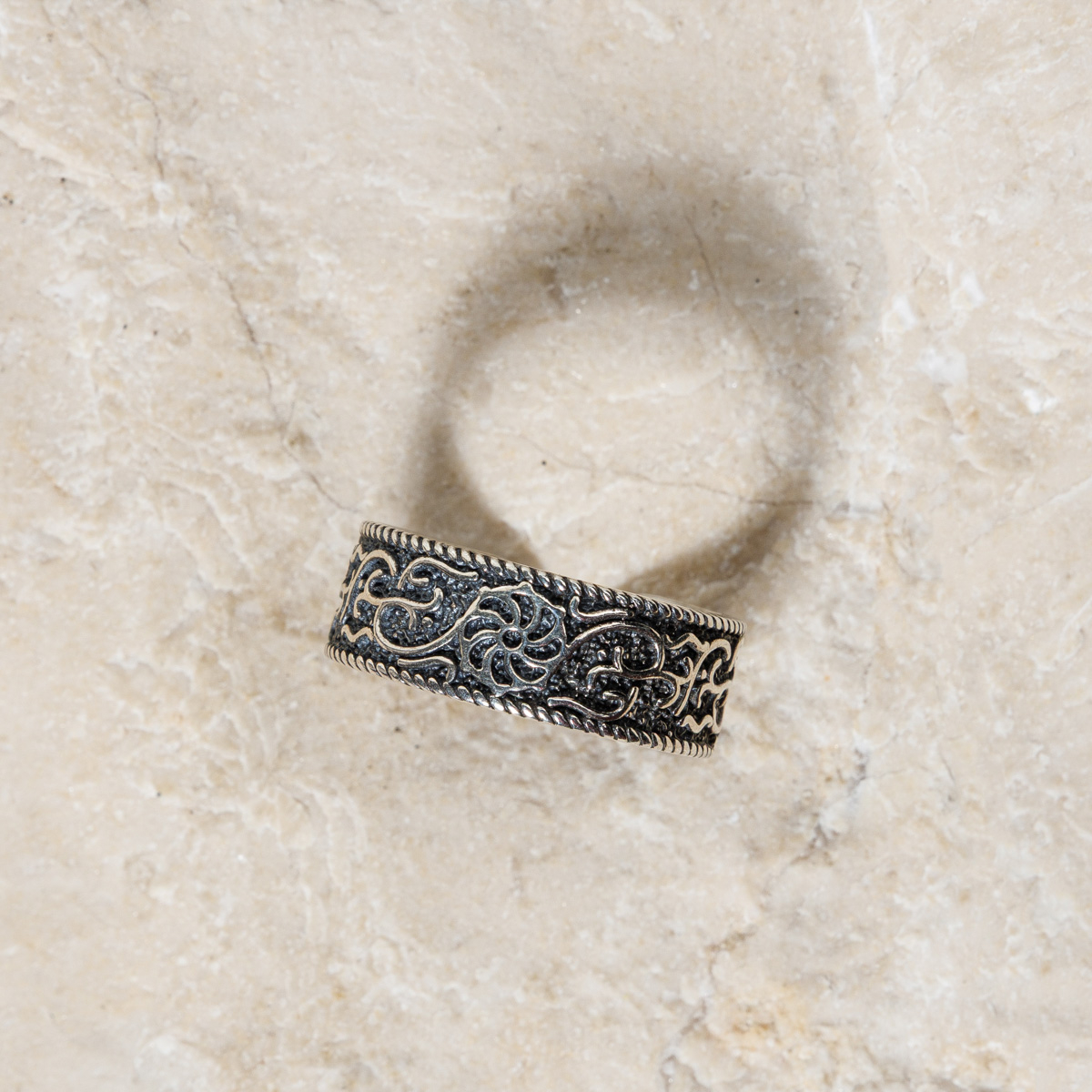 În inel, acest simbol este reprodus în mijlocul compoziției, înconjurat de motive ornamentale tradiționale. Linia continuă și formele împletite sugerează ideea de viață care nu se oprește, de legături care trec dincolo de timp.