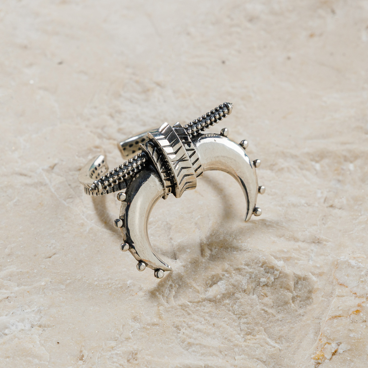 Kotoș este despre tenacitate. Despre a-ți păstra direcția, chiar și atunci când condițiile te împing altundeva. Realizat manual, cu detalii inspirate din bijuteria tradițională din zonă, inelul adaugă o notă de forță discretă oricărei ținute.