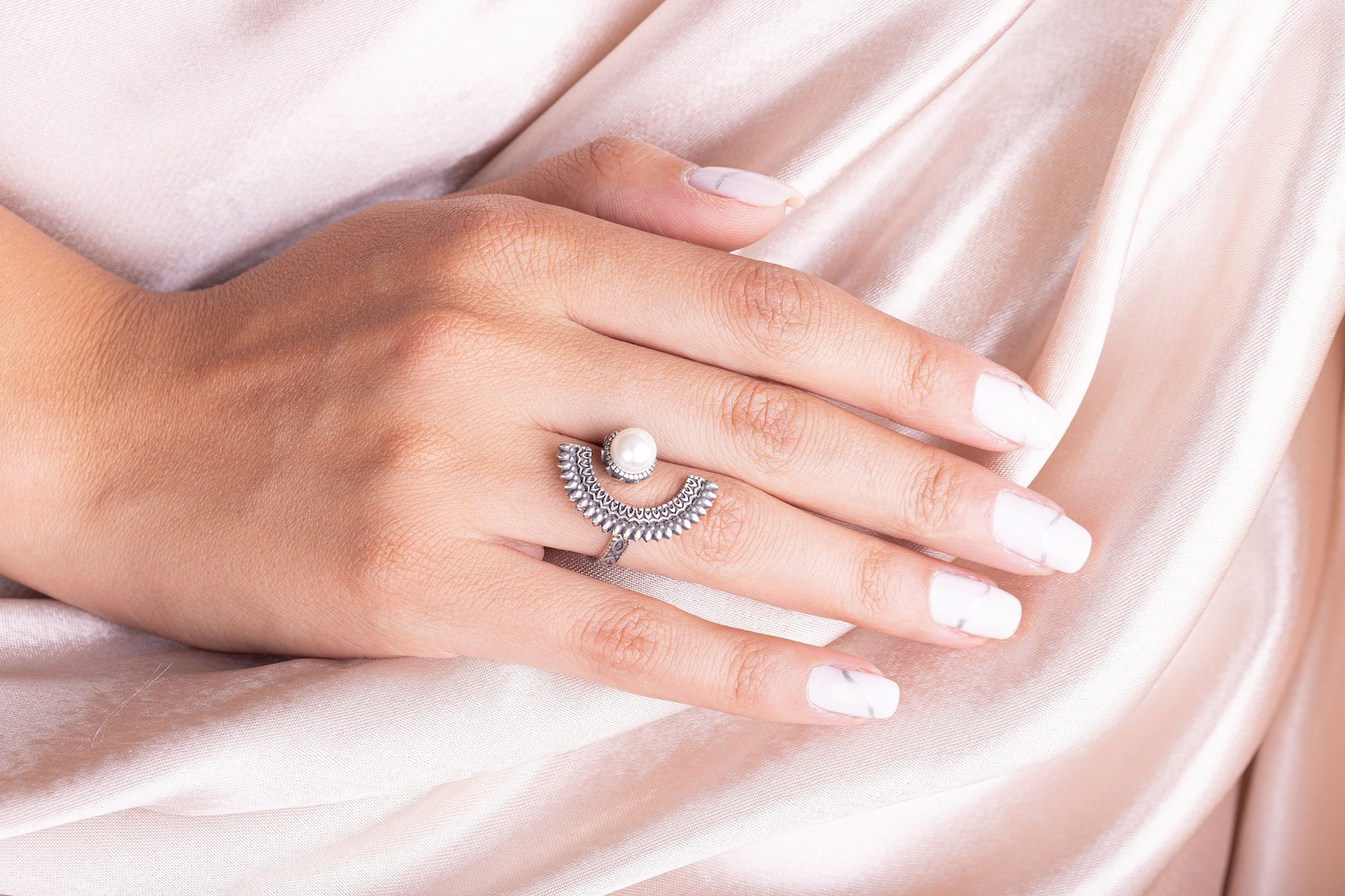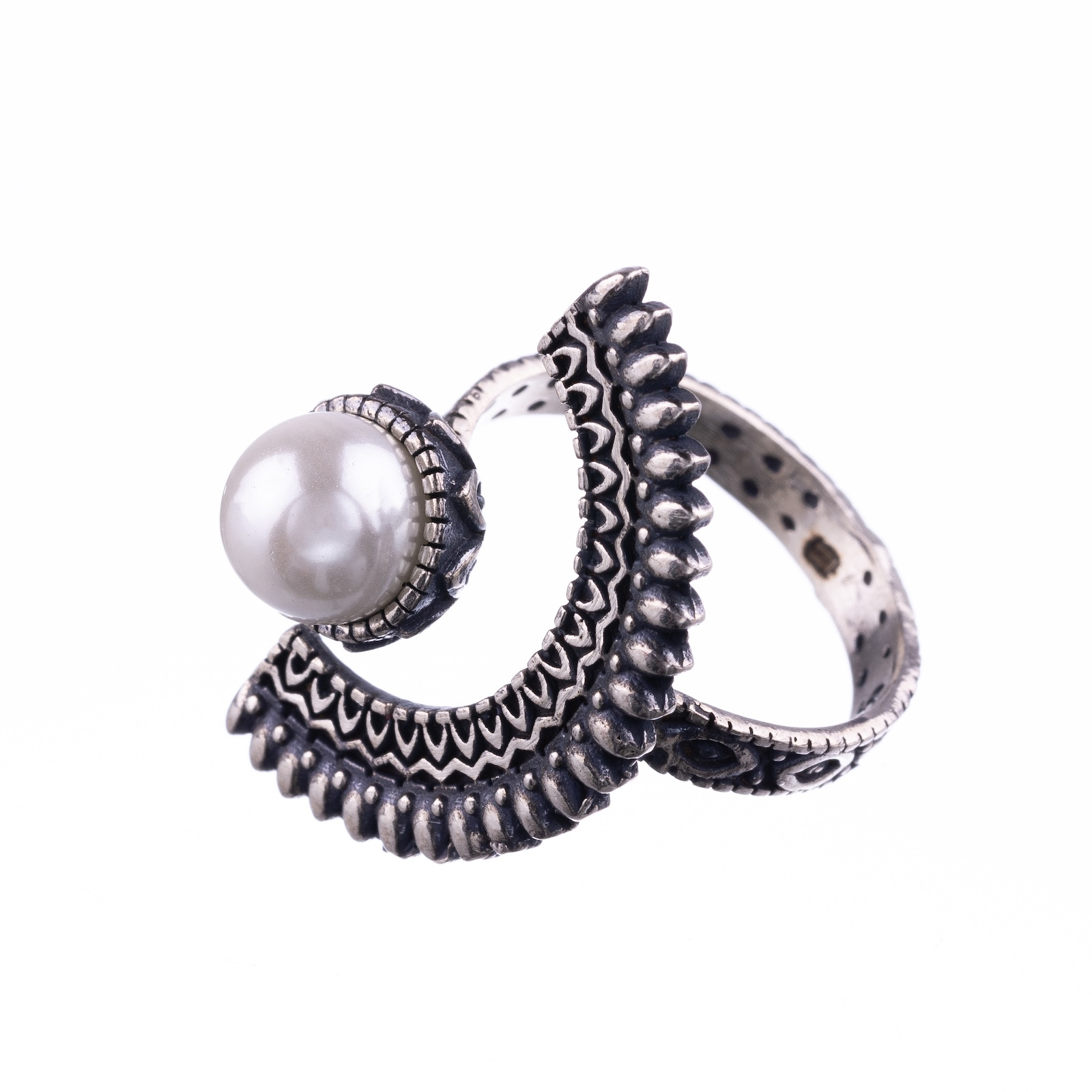 Detaliile gravate de-a lungul arcului creează un contrast între delicat și sculptural, în timp ce perla – simbol al clarității și al purității – devine punctul în jurul căruia se învârte întregul design.