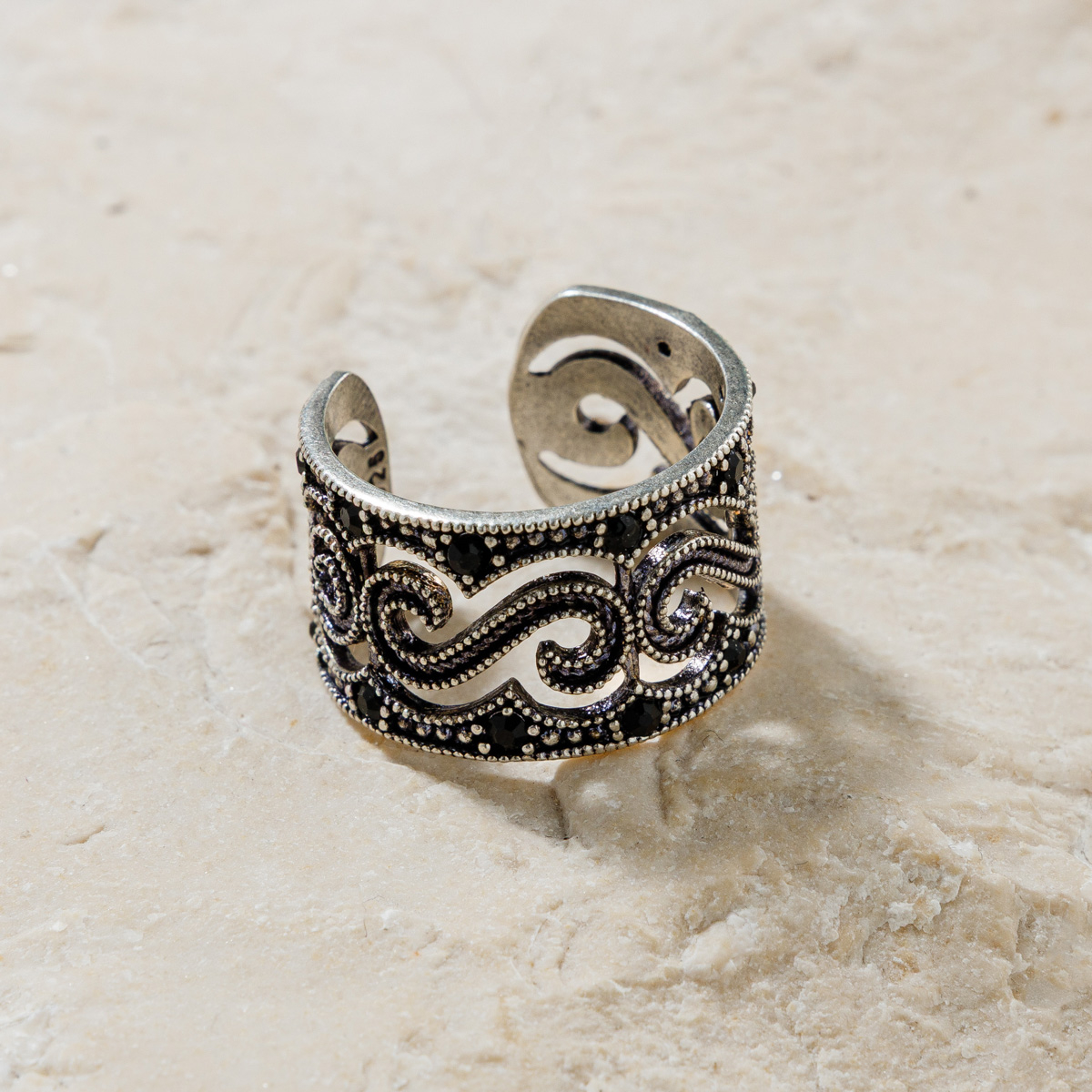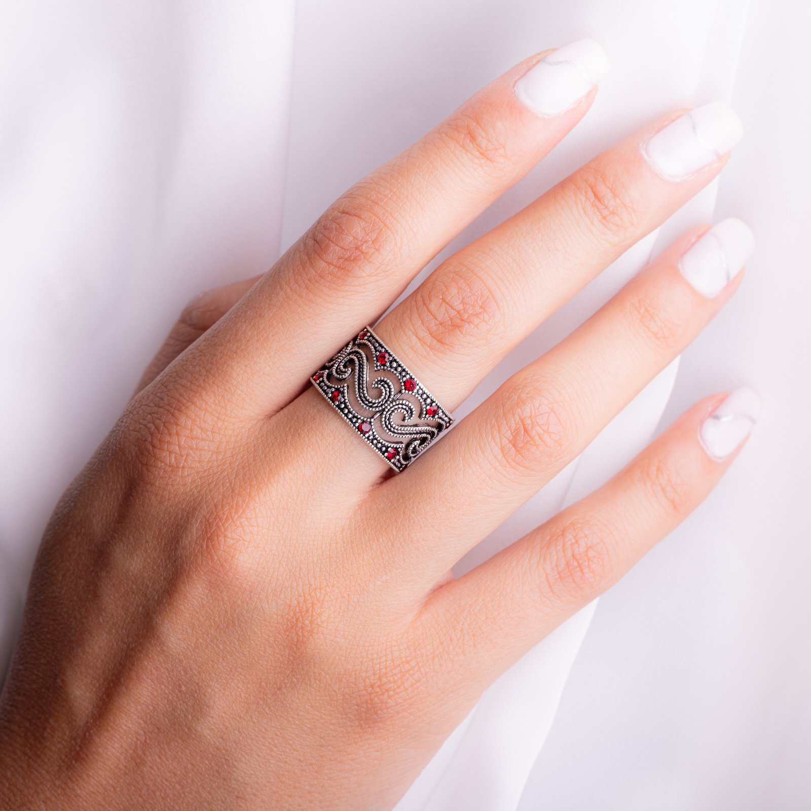 Valurile ornamentale, în care sunt inserate pietre profunde, dau senzația unui motiv viu – un ritm care curge pe deget, dar care nu se repetă niciodată exact la fel.