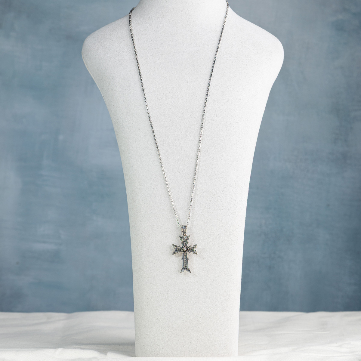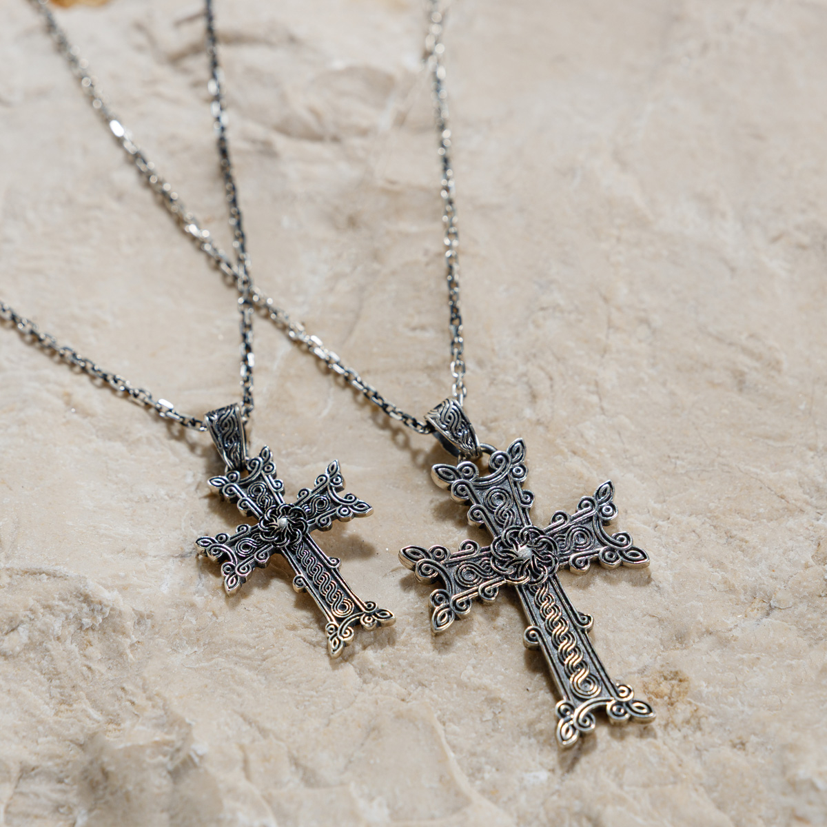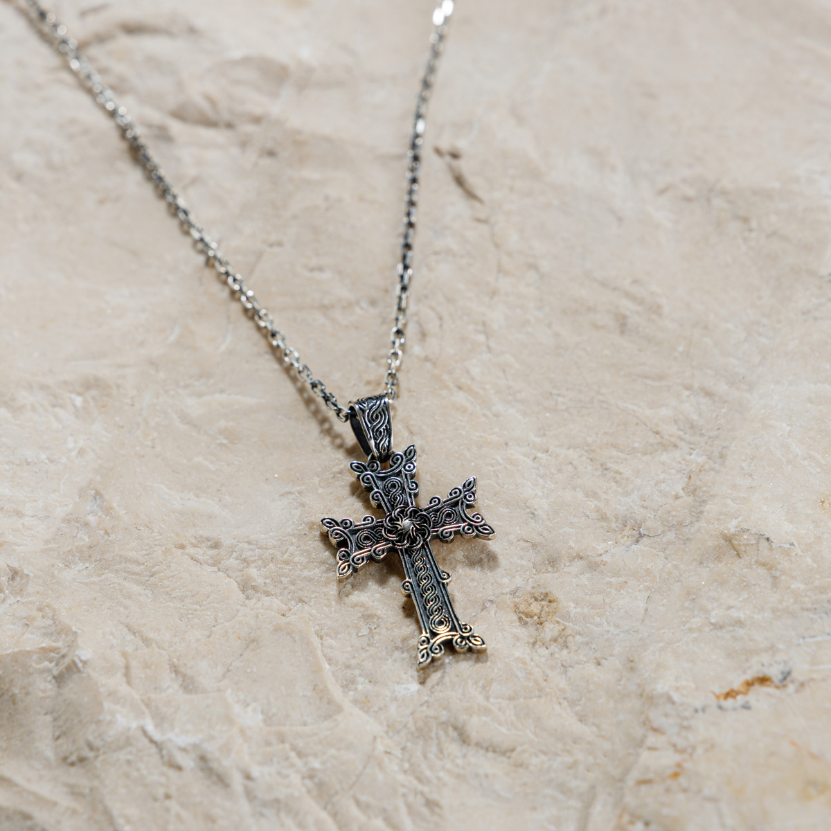 Forma crucii urmează tradiția khachkar-urilor armene, distinse prin motive florale și vegetale care simbolizează viața, renașterea și eternitatea - expresia legăturii dintre spiritual și pământesc. Realizată manual din argint 925, piesa îmbină delicatețea detaliilor cu forța simbolului.